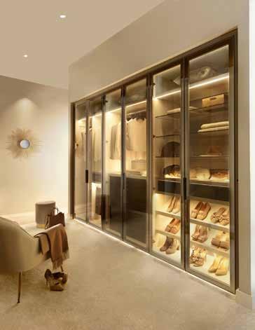 Neatsmith’s Reflex glass doors, available in natural silver or smoked grey, are among the most popular options. The doors have a secret as when lit from the inside the glass becomes transparent to reveal the contents of the wardrobe. Richer tones and textures are also on the rise, from the warmth of walnut to deep green finishes and textured surfaces such as the new Cordona collection, which adds both depth and warmth.