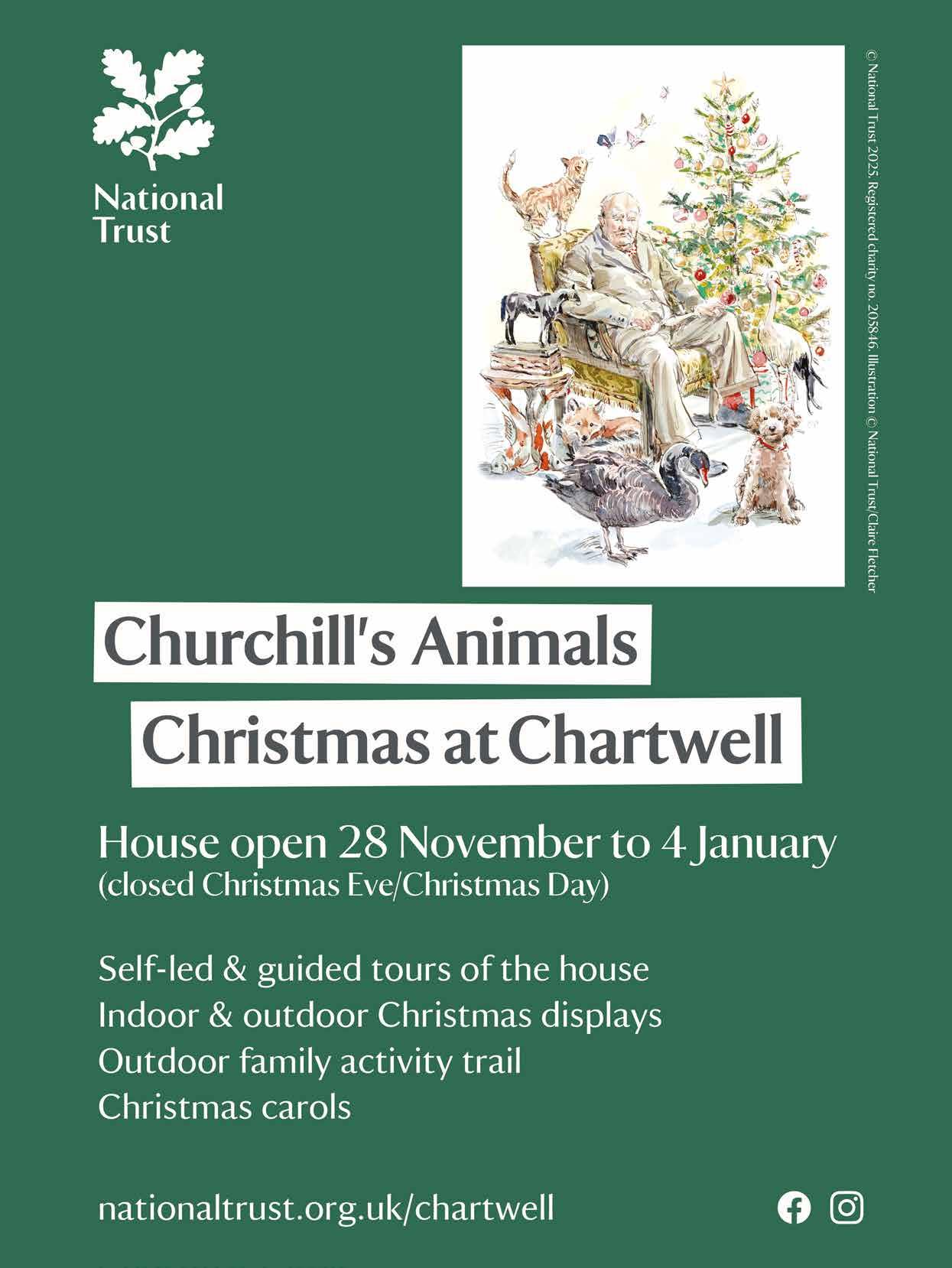 Experience the magic and wonder of Christmas, across our house and gardens, with lavishly decorated trees, shiny baubles, festive music, delightful projections and an array of enchanting animalthemed displays. As you explore inside the house, look out for decorations inspired by the delicate butterflies Sir Winston raised and released in the gardens and the golden orfe fish he fed in the ponds.