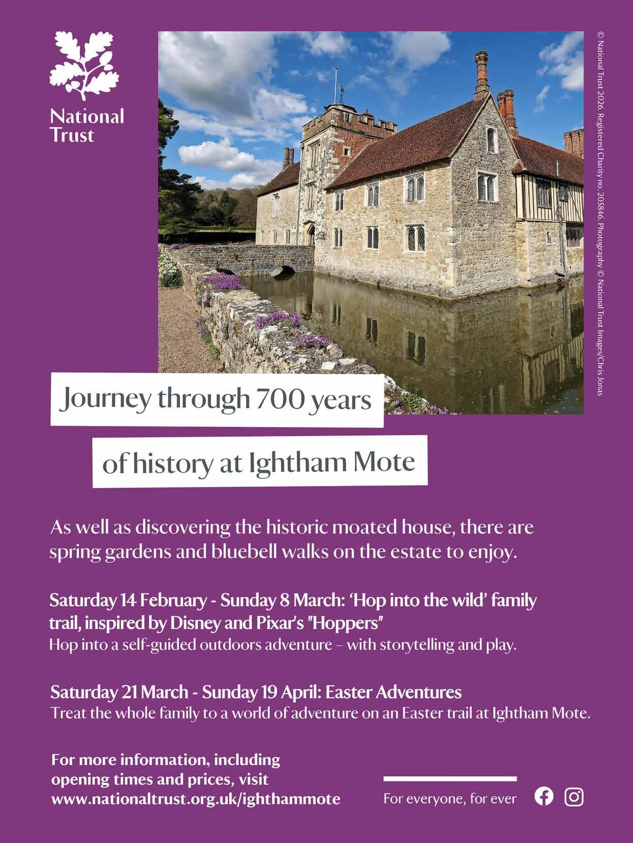Events take place at Ightham Mote throughout the year. To kick things off in 2026, from 14 February to 8 March the National Trust is celebrating the release of Disney and Pixar’s “Hoppers”, in cinemas 6 March. Discover the ‘Hop into the wild’ self-guided family trail at Ightham Mote, with storytelling and outdoor play. Collect your discovery passport, explore the animal kingdoms, and most importantly, unleash your wild side!