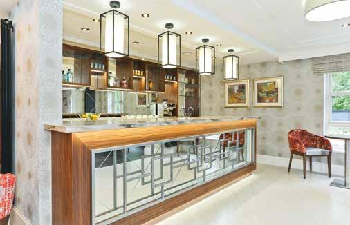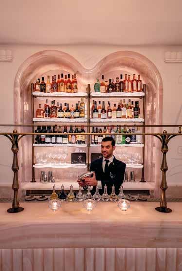 The aesthetic pays tribute to the hotel’s Art Deco design heritage, with pale pink onyx featuring prominently. The bar, in this blush-coloured stone is the centrepiece, and is complemented by a feature skylight in peach and cream coloured glass.