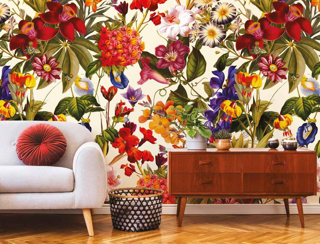 Let the wallpaper shine by picking out a core colour for the wooden cabinetry & paintwork. The closer the colour match, the stronger the impact.