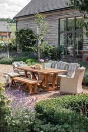 Finished in Herringbone Barley, the seat and pinched-back cushions are made from soft-touch, season-proof fabric that offers water, stain and frostresistant performance. The beautiful refectory style table and bench is crafted from solid, precision-cut teak with a smooth finish.