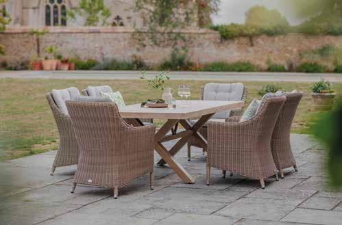 that blends beautifully with nature. Featuring a sleek ceramiceffect table, eight rope-weave chairs with season-proof cushions in Driftwood, and a matching parasol with base.