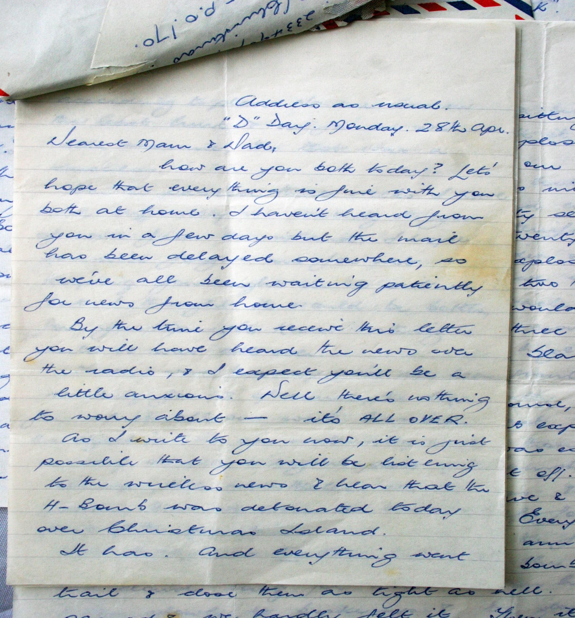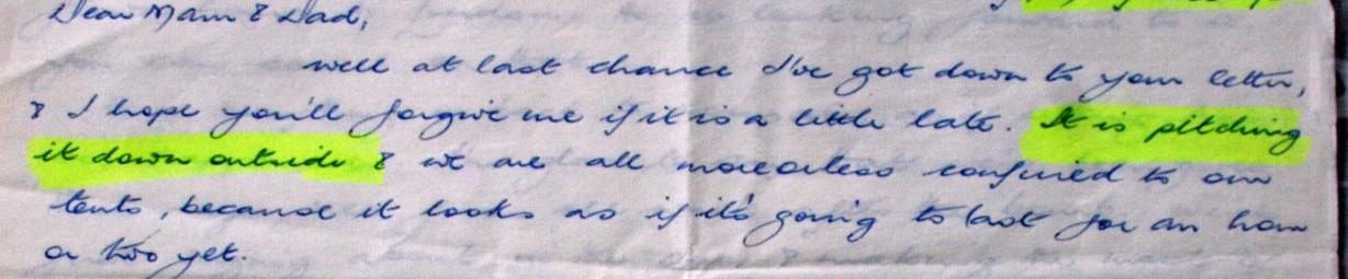 “It’s really pitching it down outside,” he wrote to his mum and dad. “We are all more or less confined to our tents because it looks as if it’s going to last for an hour or two yet.”