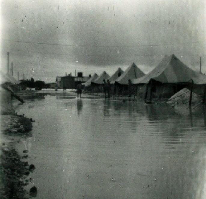 And two remarkable ‘before and after’ photographs he took at the time show the normally dry and dusty road outside his tent awash withfloodwater.