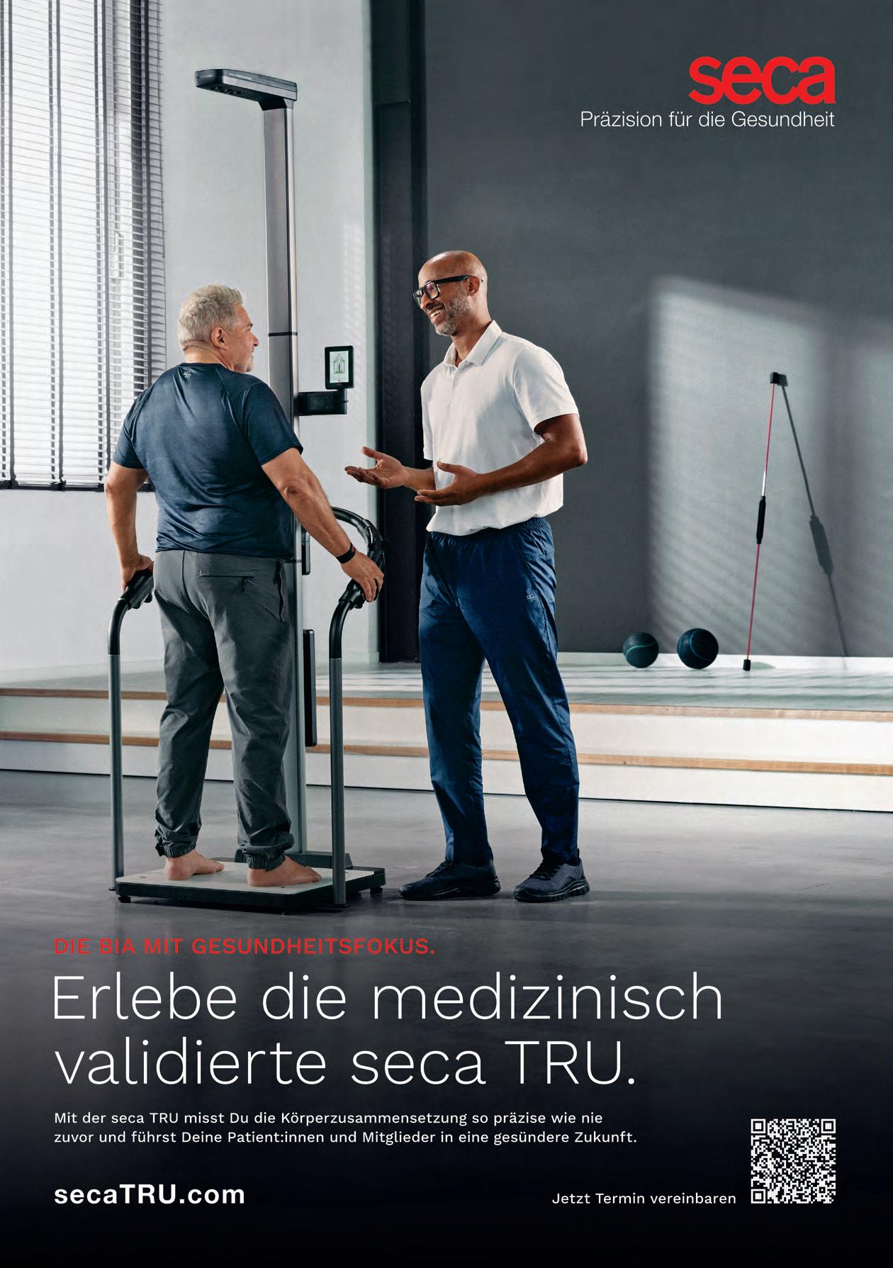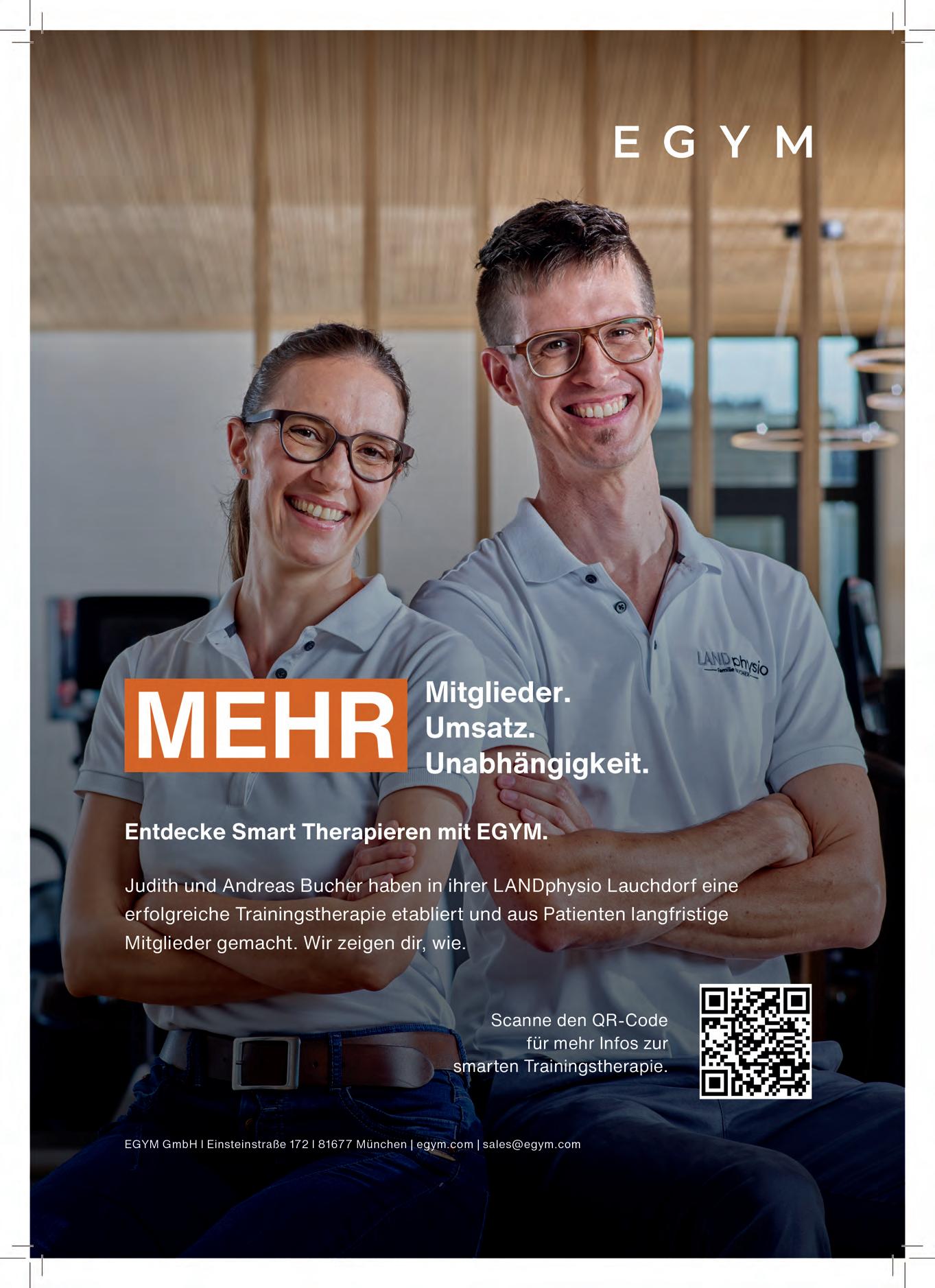 Zudem lesen Sie in unserem Best-Practice-Interview mit dem Gesundheitszentrum Körperglück, wie Therapie und Privatzahlerbereich bereits heute Hand in Hand gehen und wie Patienten zu Kunden werden. Sicherlich finden Sie hier auch ein paar Inspirationen für Ihre eigene Praxis oder Ihr Studio (S. 18). Zudem zeigen wir Ihnen, wie Menschen mittels Gesundheitsberatung von der Therapie zum langfristigen Training überführt werden können (S. 36). Weitere Fachartikel mit Lösungsstrategien, um den gesellschaftlichen Herausforderungen der zunehmenden Verbreitung von Zivilisationskrankheiten entgegenzuwirken sowie der Überalterung gerecht zu werden, finden Sie ab Seite 72.