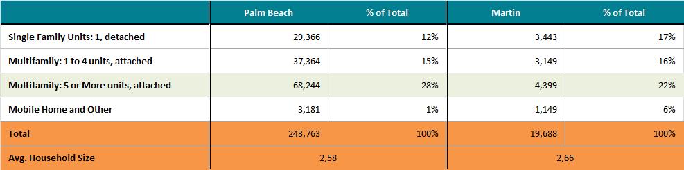 An analysis of housing units by structure type indicates that single-family detached structures comprise the single largest unit/structure type in both counties. Single-family detached structures comprise 46 percent (302,192 units) in Palm Beach County and 53 percent (41,091 units) in Martin County. Multi-family structures (1-unit, attached and above) comprise 32 percent (335,476 units) of the total inventory in Palm Beach County and 22 percent (28,335 units) in Martin County.