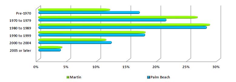 The housing supply in Palm Beach and Martin Counties is very similar in terms of age. The vast majority of units (over 80 percent) were built after 1970. While the overall age of the housing stock in both counties is relatively new, the fact that over 120,172 units are now approaching over 50 years of age raises housing preservation issues. The older housing stock, particularly older rental housing units, often has code and deferred maintenance issues that can impact the longevity of the housing structure.