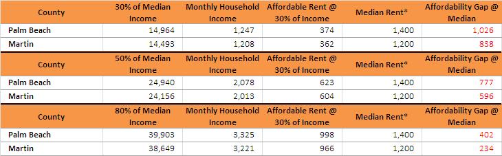 Approximately 60 percent of Palm Beach County’s and over 65 percent of Martin County’s renter households earn less than 50 percent of the area median income (AMI);