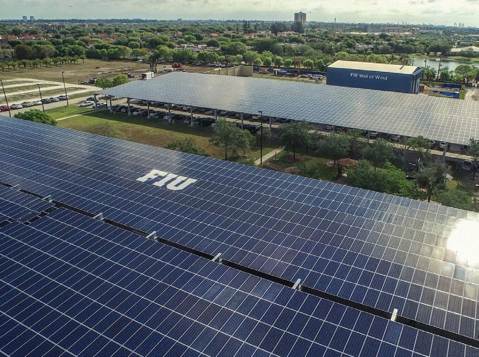Microgrid technology uses a local energy source to power homes, schools and businesses in the wake of disruptive weather. At FIU, energy is collected via a solar canopy installed in 2016 (pictured) over a parking lot adjacent to the 480,000-square-foot engineering building. Continuously collected data about power availability — solar being an intermittent source of energy — has been used by Eminent Scholar Chaired Professor Arif Sarwat and a team of students to perform simulations to determine usage optimization.