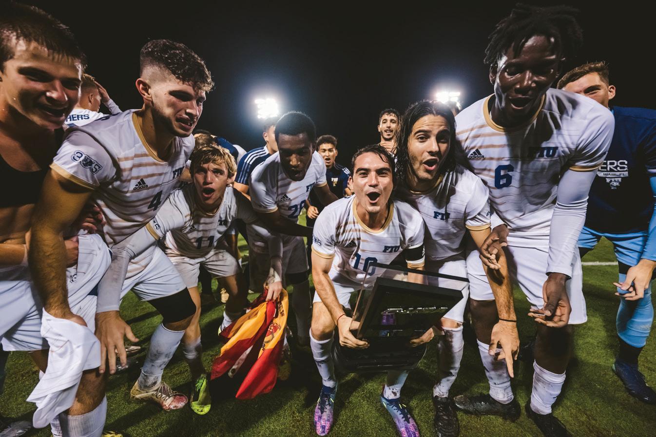 The men's soccer team exults in its capture of the Conference USA regular season championship after knocking off No. 1-ranked Marshall at home.