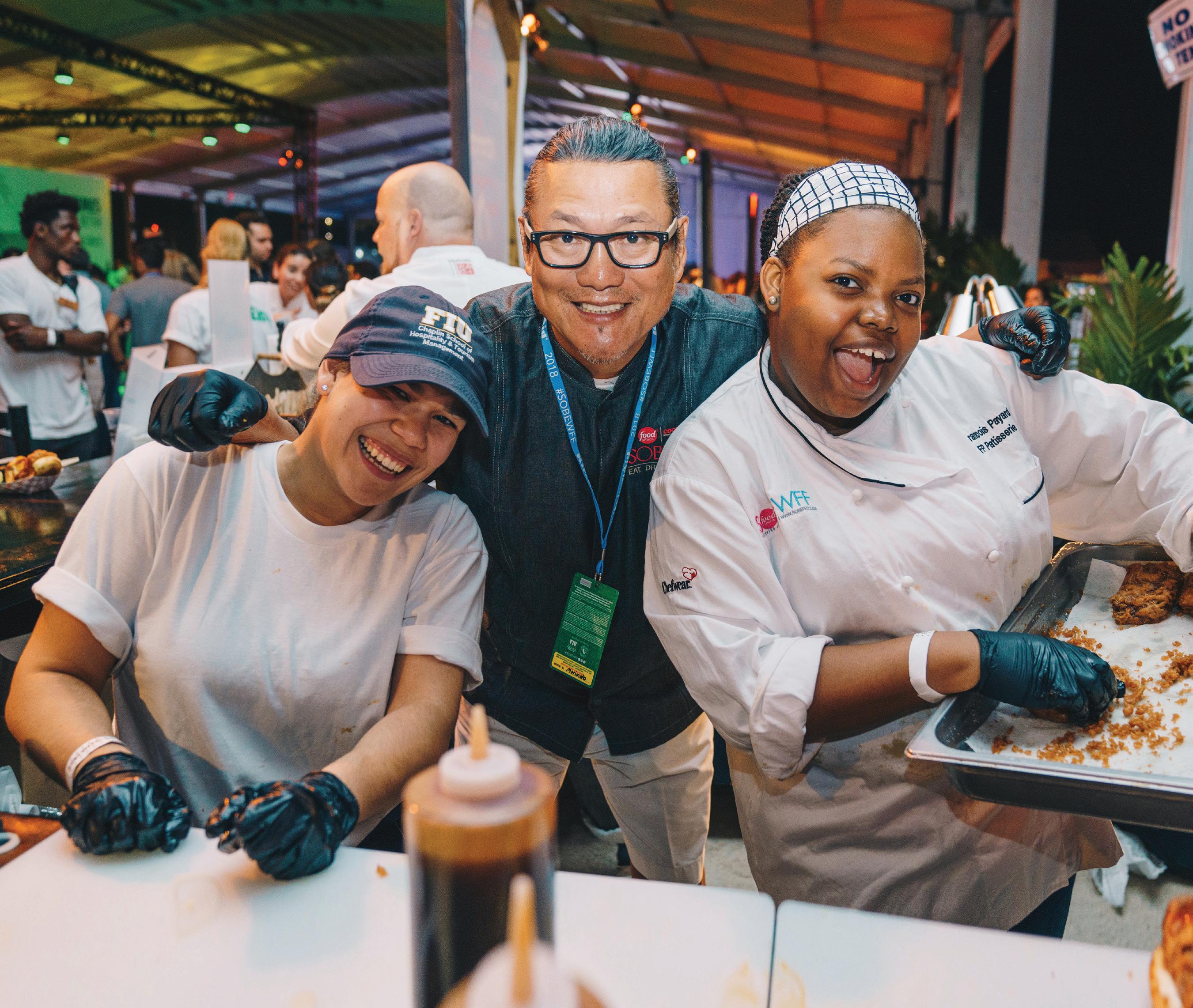 The internationally famous Food Network & Cooking Channel South Beach Wine & Food Festival comes to life on the management skills of students in the Chaplin School of Hospitality and Tourism Management, which offers degrees to aspiring leaders of the restaurant, hotel and related industries. While they put their classroom instruction to real-world use during months of logistical preparations — the festival annually sees thousands of visitors attend upwards of 90 star-studded dinners, tastings and workshops over four days — other students from throughout the university volunteer as servers and, as seen here with Iron Chef Masaharu Morimoto and a pastry professional, assistants to the dozens of celebrity chefs on hand to dazzle the crowds. Since its inception 21 years ago, the fundraiser has supported scholarships and programming with proceeds of more than $30 million.