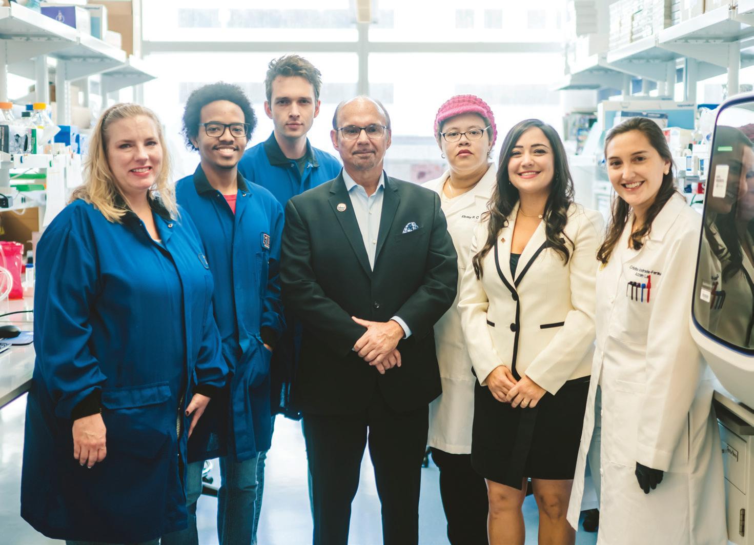 Led by Tomás R. Guilarte, in suit jacket, and Diana Azzam, in white suit jacket, members of the FIU research team contributed to a new brain-cancer discovery: from left, Jennifer McGlothan Dziedzic, Daniel Martinez, Alexander Rodichkin, Guilarte, Ebony Coats, Azzam and Cristina Andrade-Feraud.