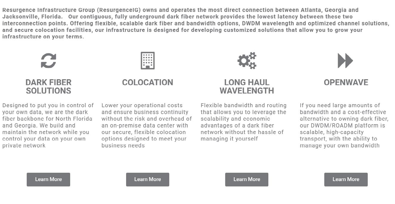 Resurgence Infrastructure Group (ResurgenceIG) owns and operates the most direct connection between Atlanta, Georgia and Jacksonville, Florida. Our contiguous, fully underground dark fiber network provides the lowest latency between these two interconnection points. Offering flexible, scalable dark fiber and bandwith options, DWDM wavelength and optimized channel solutions, and secure colocation facilities, our infrastructure is designed for developing customized solutions that allow you to grow your infrastructure on your terms.
