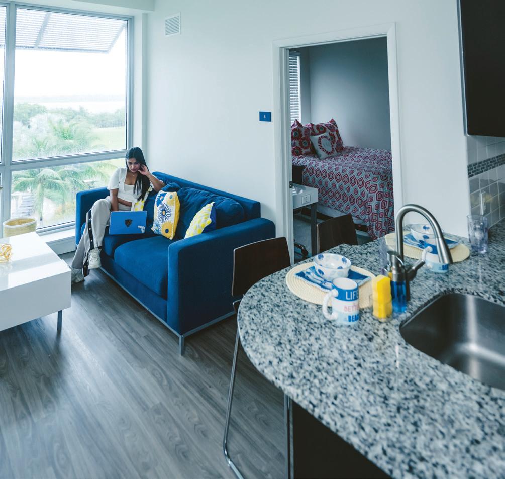 Our housing facilities are equipped with state-ofthe-art security systems, and the lobby of each hall has a desk staffed 24/7 to ensure a secure living environment for all residents. Each unit is also equipped with an emergency call button that a student can press to have a direct line to oncampus dispatch.