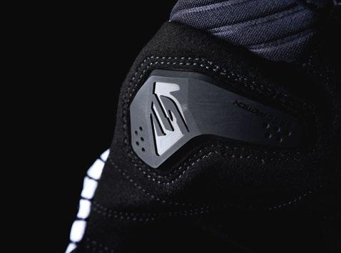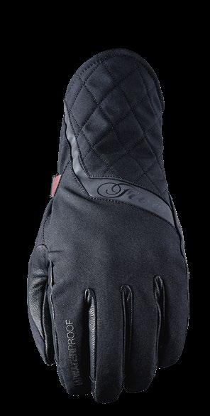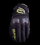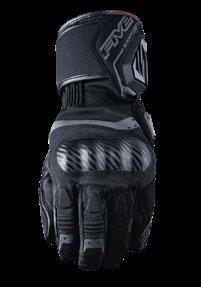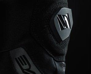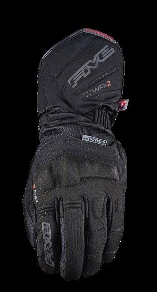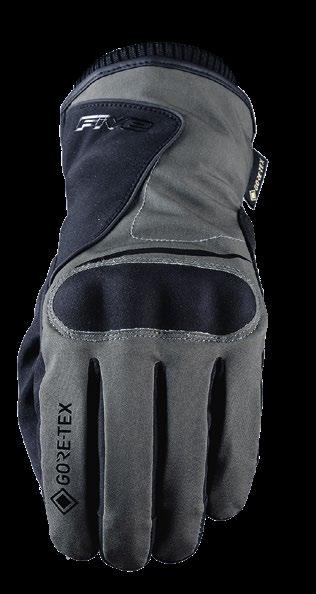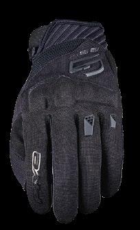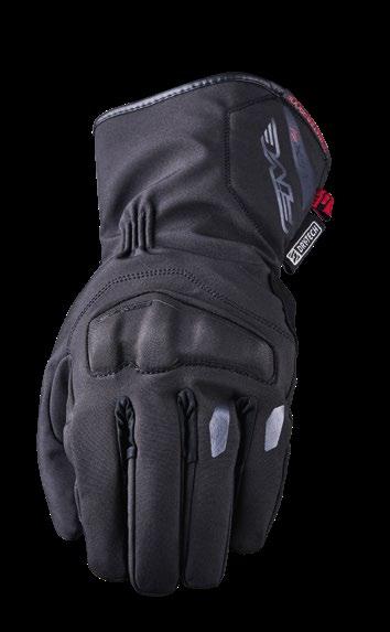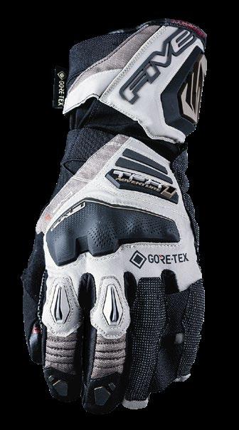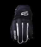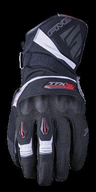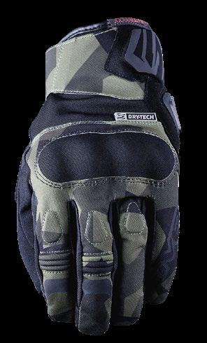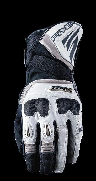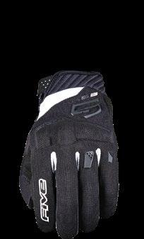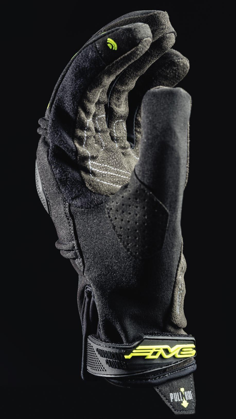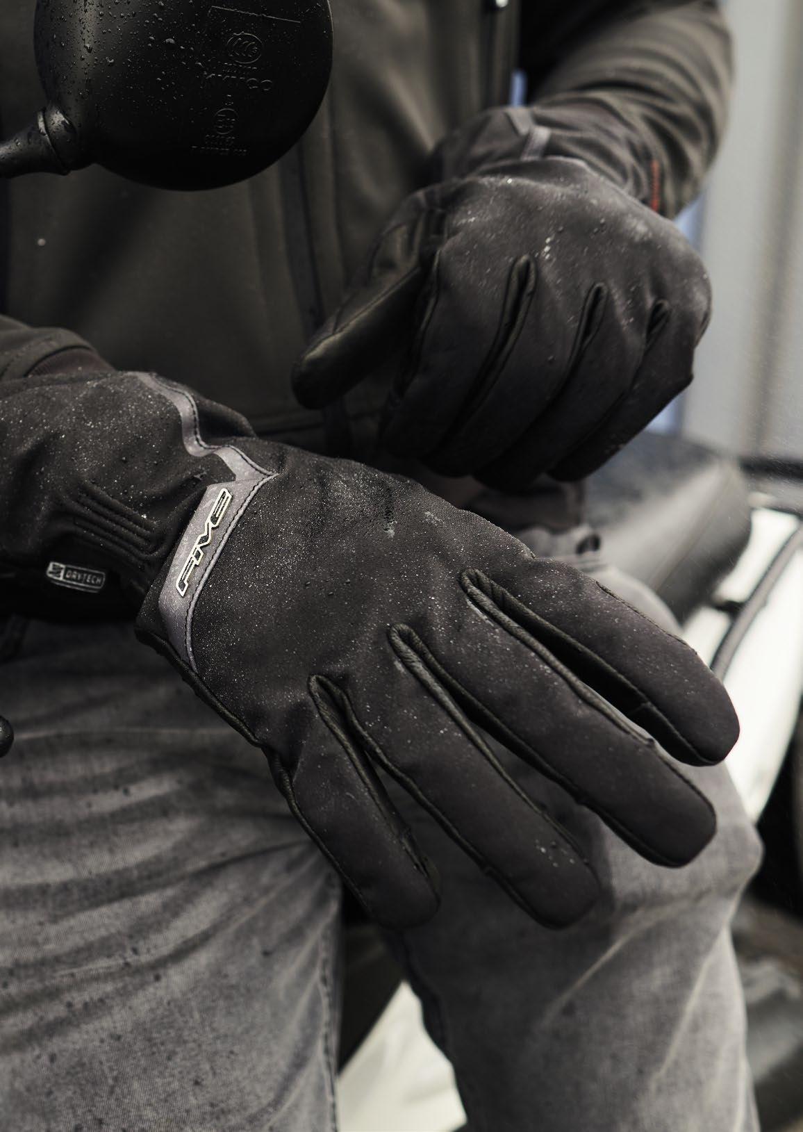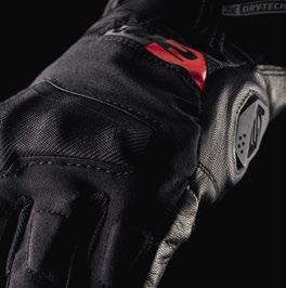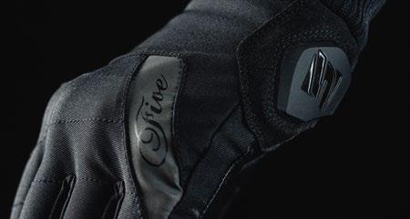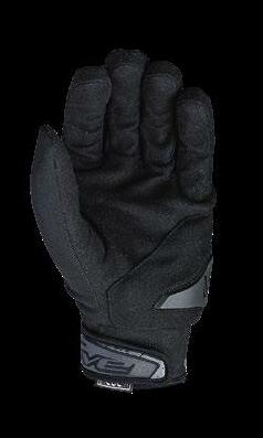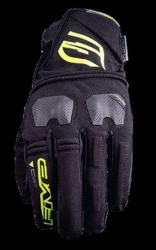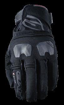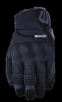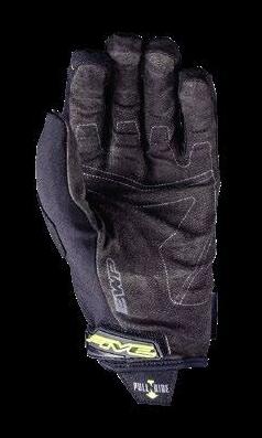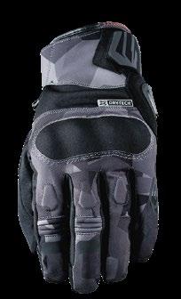 Parce que le tout-terrain (enduro, quad, atv) se pratique en toutes saisons, y compris lorsque les conditions météorologiques se montrent défavorables, il est judicieux de s’équiper en conséquence. FIVE introduit le E-WP, un gant tout-terrain doté de la membrane étanche respirante 5_DRYTECH™ et d’un revêtement extérieur déperlant et extensible. Il se montre redoutablement efficace et confortable pour affronter le vent et la pluie, autant d’éléments qui accompagnent parfois les longues sorties en pleine nature. Constitué de matériaux ré sistants, à l’abrasion comme à l’humidité, le E-WP ne devrait jamais quitter votre sacoche banane ou votre sac à dos, lorsque le temps se montre incertain, afin de continuer à rouler les mains au sec à la moindre averse. Une paume en cuir synthétique AX Suede® embossé afin d’accroître l’adhérence aux poignées humides voire entachées de boue, offre un ex cellent contrôle des commandes et un confort appréciable. Surtout lorsque les heures pas sées au guidon deviennent interminables dès lors qu’on les passe sous des trombes d’eau. Doté du système Touch Screen™ de manipulation des écrans tactiles et du Clear Vision Pad™, vous pourrez toujours actionner votre GPS ou essuyez l’extérieur de votre masque pour retrouver votre chemin. Vous finirez peut-être votre journée exténué et trempé de la tête aux pieds… mais vous garderez les mains au sec grâce à l’E-WP.
