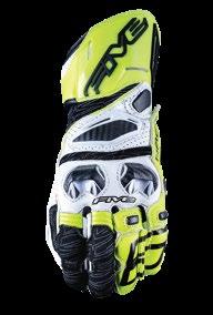 Le plus avancé des FIVE ADVANCED GLOVES™. Conçu pour la haute performance, le RFX Race offre le plus haut degré de sécurité disponible actuellement, grâce à sa triple coque de protection en Carbone Composite Thermoset. Matériau que l’on retrouve généralement en aéronautique ou Formule 1, et qui offre une résistance exceptionnelle à l’abrasion. Ce qui rend ce gant plus efficace qu’un gant ordinaire dans les situations extrêmes de longues glis sades où la main du pilote peut se retrouver coincée entre la piste et la moto. La protection est optimisée par l’usage de cuir pleine fleur, de nombreux renforts en carbone traditionnel et d’une doublure interne en Kevlar®. La paume accueille un renfort en cuir digital pour un grip optimal en conditions humides. La patte d’ajustement par velcro est dissimulée sous un panneau de protection en cuir pour pallier aux risques d’arrachement en cas de chute. Précision de pilotage et confort ont fait l’objet de la plus grande attention. RFX Race : le gant développé et utilisé par les pilotes officiels FIVE en Championnats du Monde MotoGP, SBK et Endurance.