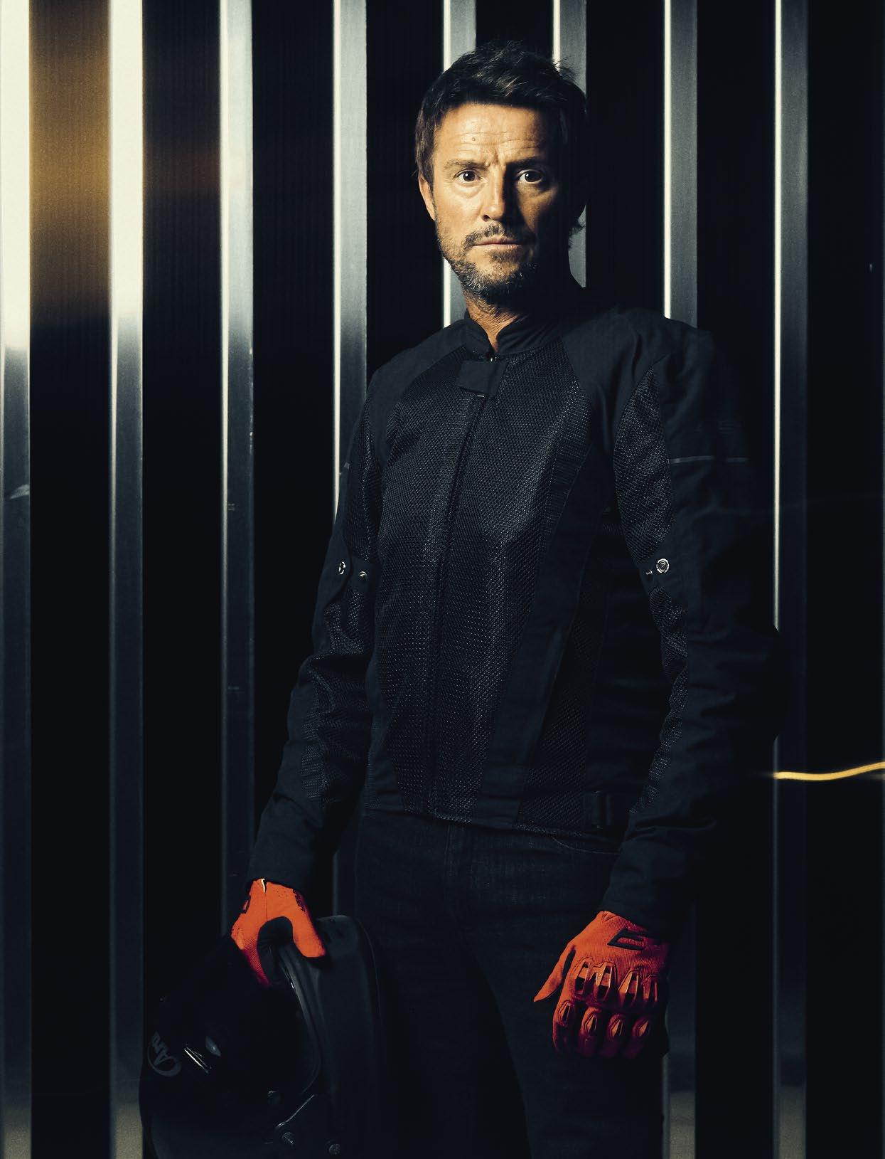 Couverture - Sébastien CHARPENTIER ///// STUNT EVO 2. Premier pilote Français à avoir remporté deux titres de Champion du Monde 600cc Supersport en 2005 et 2006, Sébastien CHARPENTIER n’a jamais cessé de piloter. Devenu ambassadeur HONDA, il partage avec enthousiasme sa passion du pilotage en encadrant des journées de perfectionnement sur de nombreux circuits du monde, allant jusqu’à « coacher » sur piste le président de la firme japonaise qui l’emploie. À l’approche de la cinquantaine, Seb s’entretient toujours physiquement, en pratiquant assidument le cyclisme sur route, ce qui lui assure une allure d’éternel jeune premier. Et c’est tel un gamin qu’il voue une véritable passion aux baskets et autres sneakers, qu’il collectionne frénétiquement. Il détient de nombreuses pièces rares dont la valeur, parfois inestimable, ne l’empêche pas de les porter aux pieds au quotidien. Seb soigne son apparence, à la ville comme à moto et apprécie les équipements de premier plan. C’est ainsi qu’il a choisi de porter des FIVE RFX Race, le nec plus ultra en matière de gants Racing, lors de ses innombrables journées sur circuit. Lorsqu’on lui a parlé du nouveau STUNT EVO2, il a immédiatement adhéré au concept innovant et à l’esthétique avant-gardiste du produit. Associer une paire de STUNT EVO2 rouge vif à une tenue et une moto totalement noires relevait, pour lui, de l’évidence. Le résultat est percutant. A l’image d’une paire de baskets culte que l’on arbore comme un « signe extérieur de richesse », le STUNT EVO2 peut et doit se porter avec fierté. A la fois pilote émérite et amateur de mode urbaine, Sébastien CHARPENTIER était bien l’homme idéal pour représenter notre nouveau modèle iconique dans ces pages…
