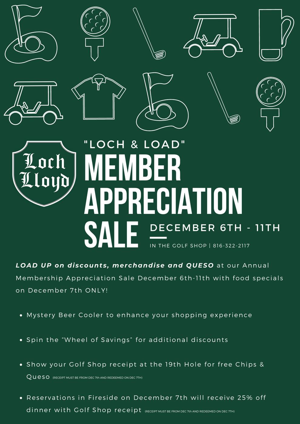 In addition to the sale running all week, join us for LOCH & LOAD on December 7th where you can LOAD UP on discounts, merchandise and QUESO! We will roll the mystery beer cooler down to the Golf Shop and each member who comes through the doors can grab a beer and load up on sales