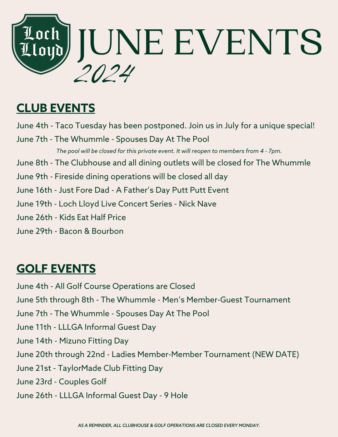 We have a busy June planned with play days, informal guest days and, from the Golf Shop, the Ladies Member/Member event! The following is what’s scheduled: