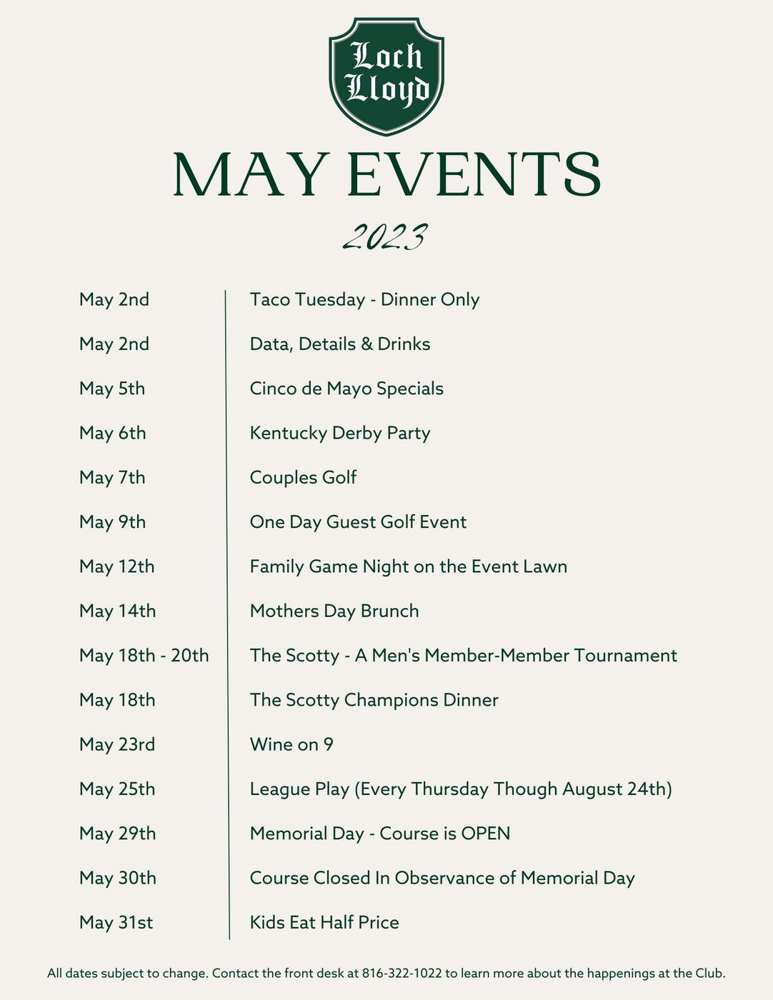 Jumping back into the swing of things as our golf season kicks off, our events calendar is equally as exciting as we look forward to Cinco De Mayo celebrations, Mother's Day brunches, Family Game Nights on the Event Lawn and more. I look forward to seeing each of you at the Club as exciting things are happening here at Loch Lloyd.