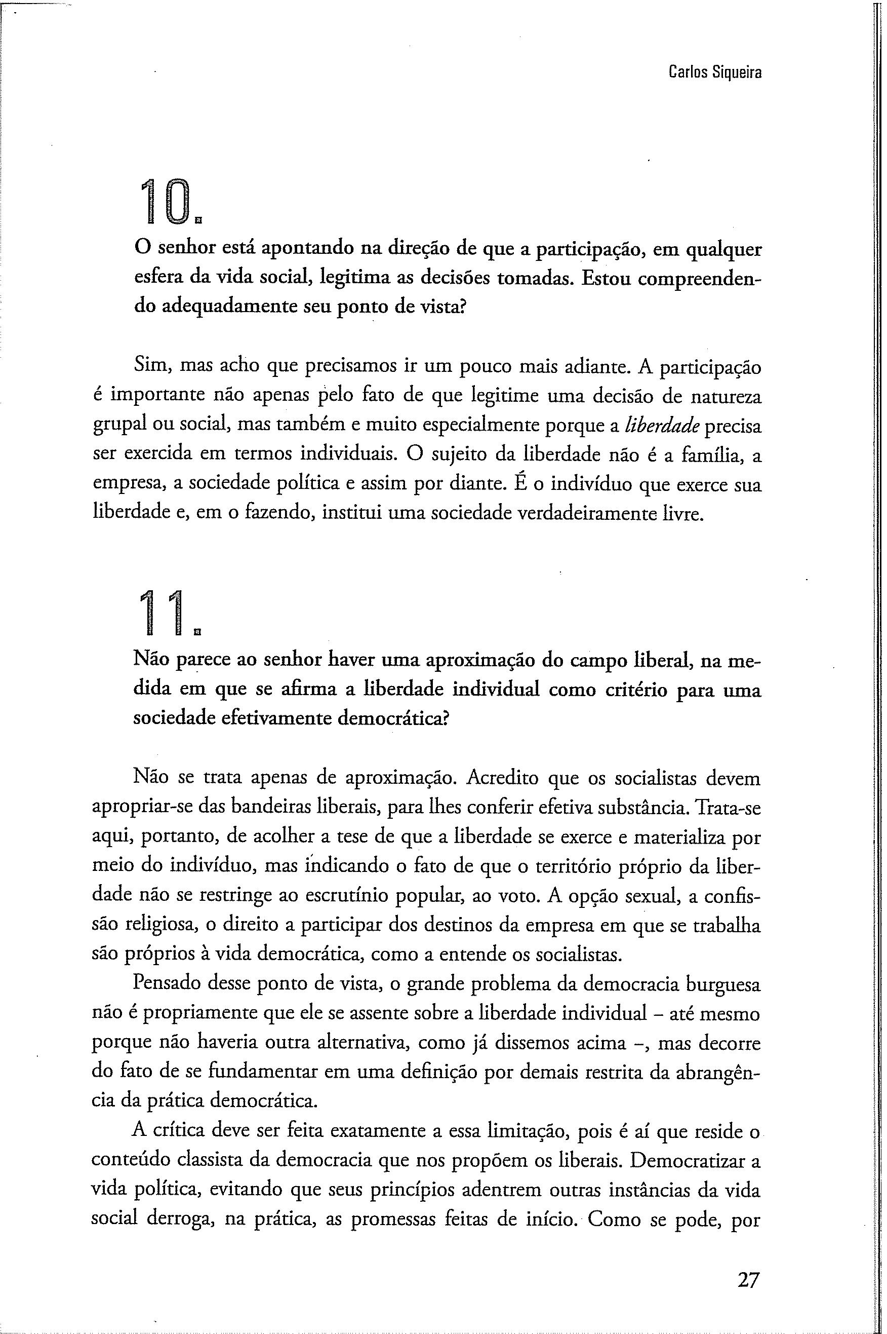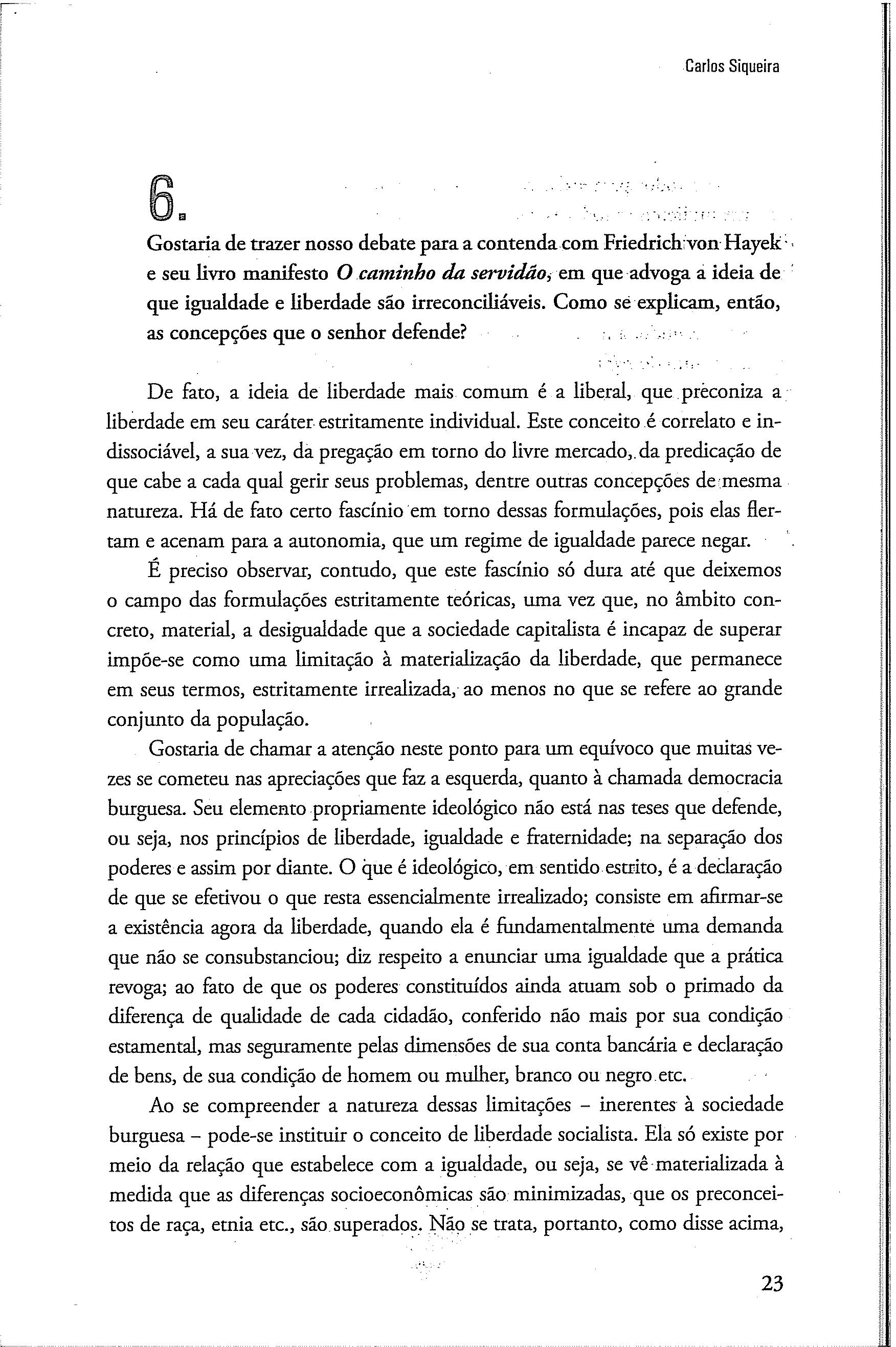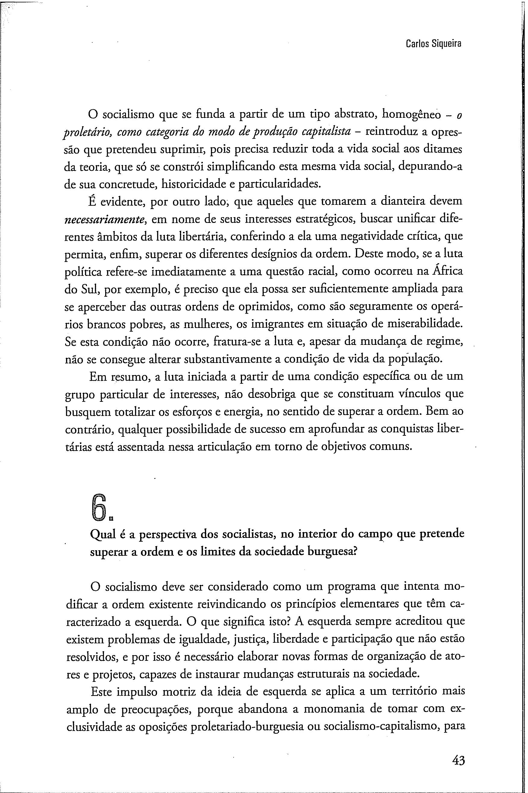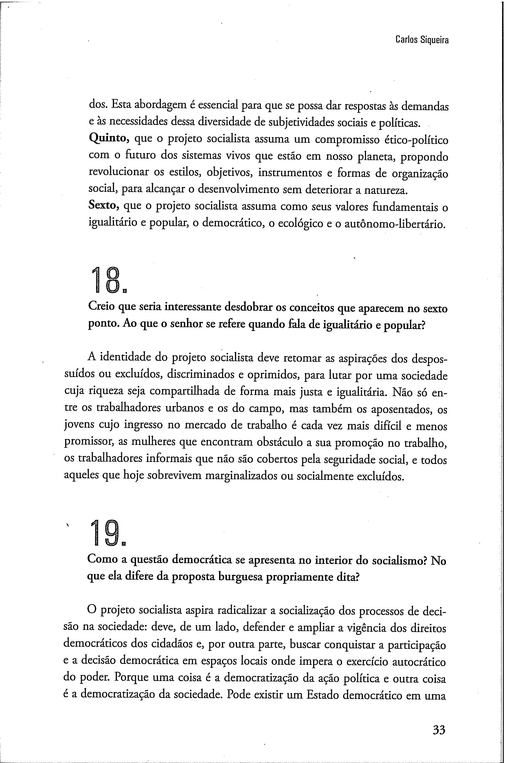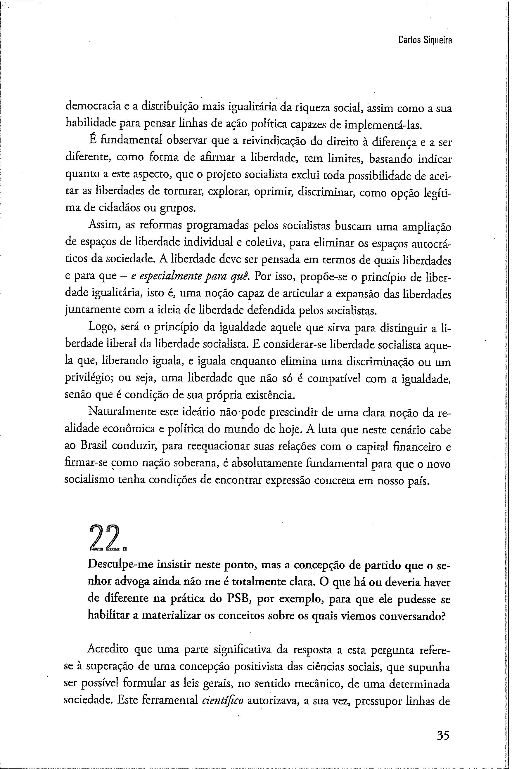 Publicação de 2009 que consiste em uma entrevista com Carlos Siqueira acerca de temas ligados ao socialismo, como: a diferença entre a concepção socialista e a liberal sobre a Liberdade; a necessidade de uma reforma política; características do neoliberalismo; qual o papel do PSB atualmente, entre outros.