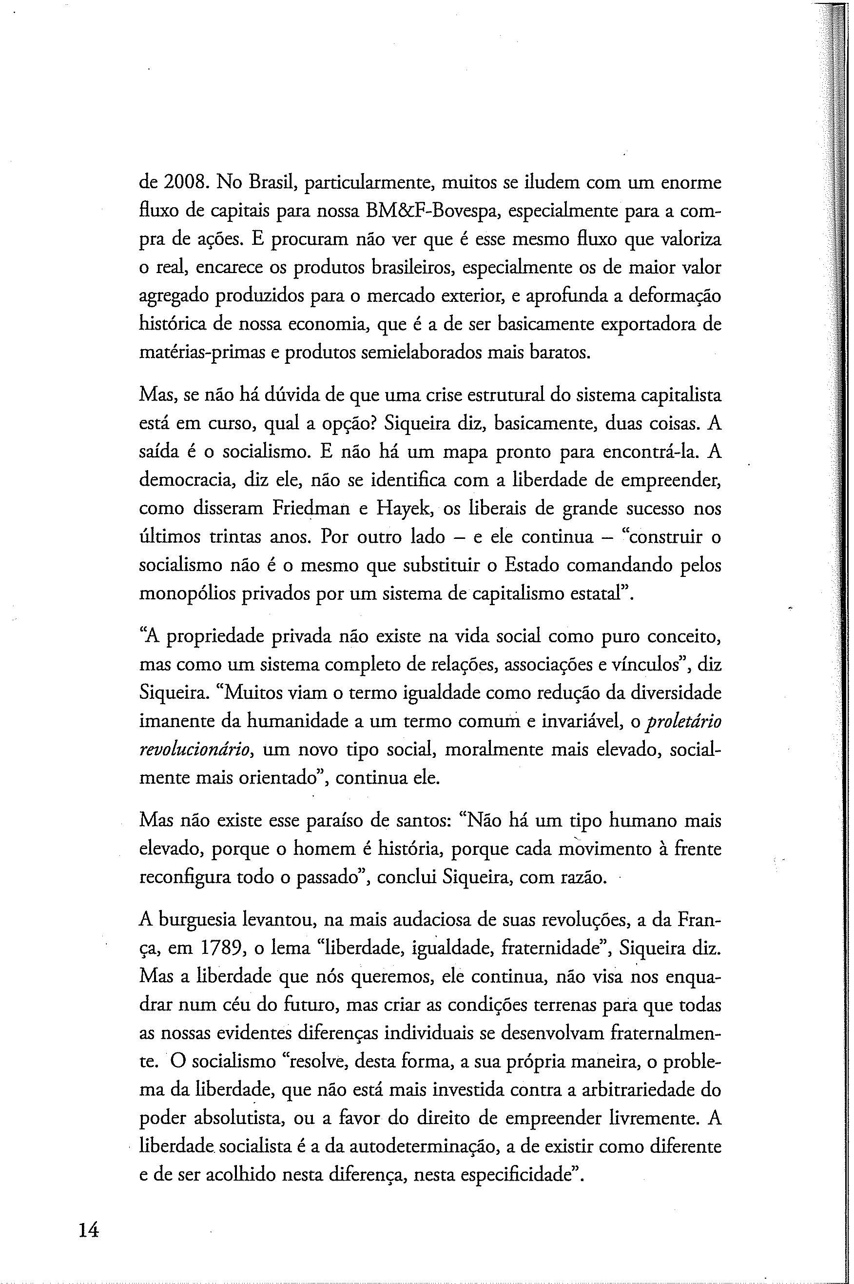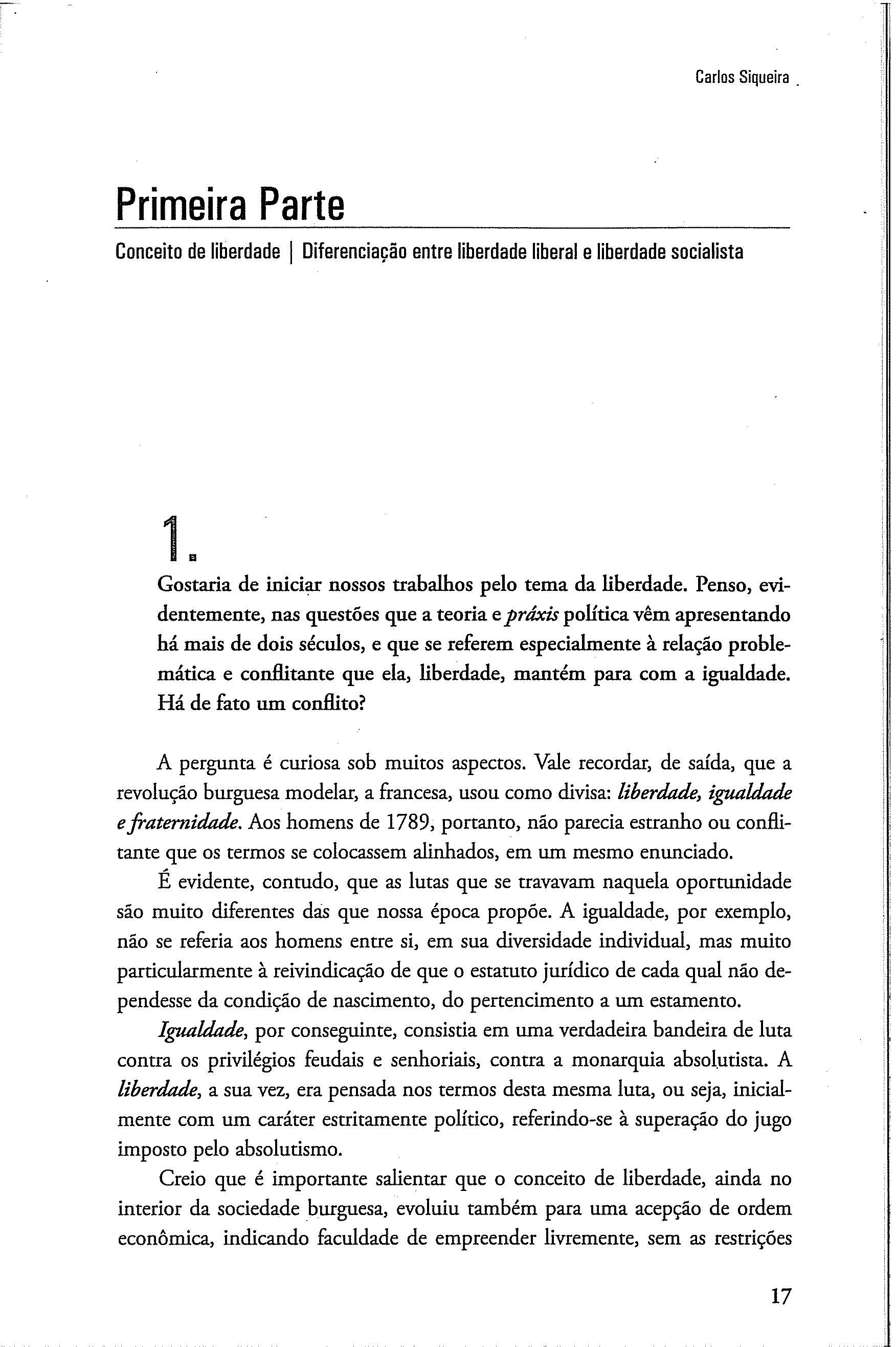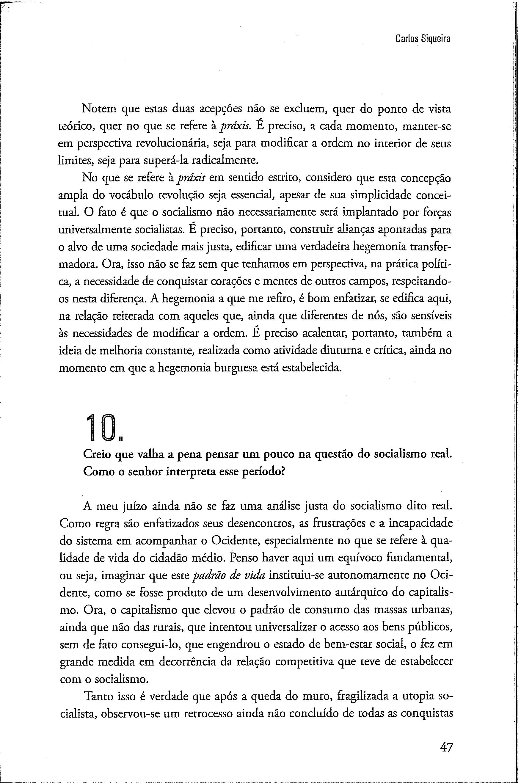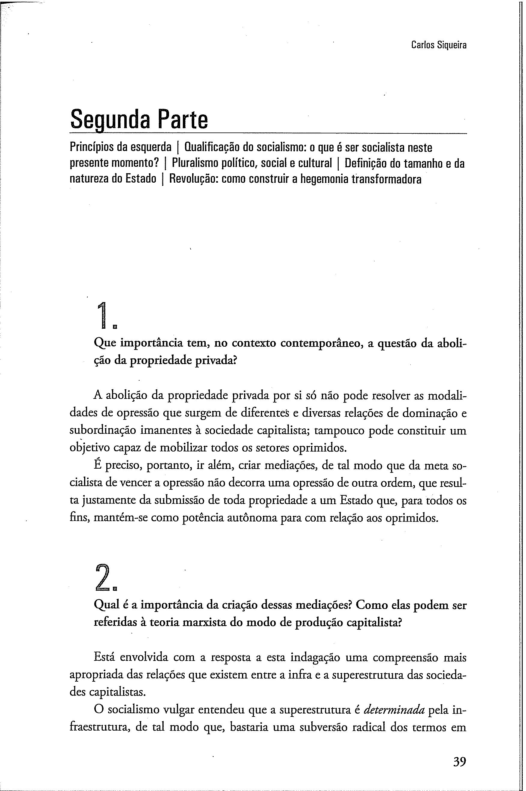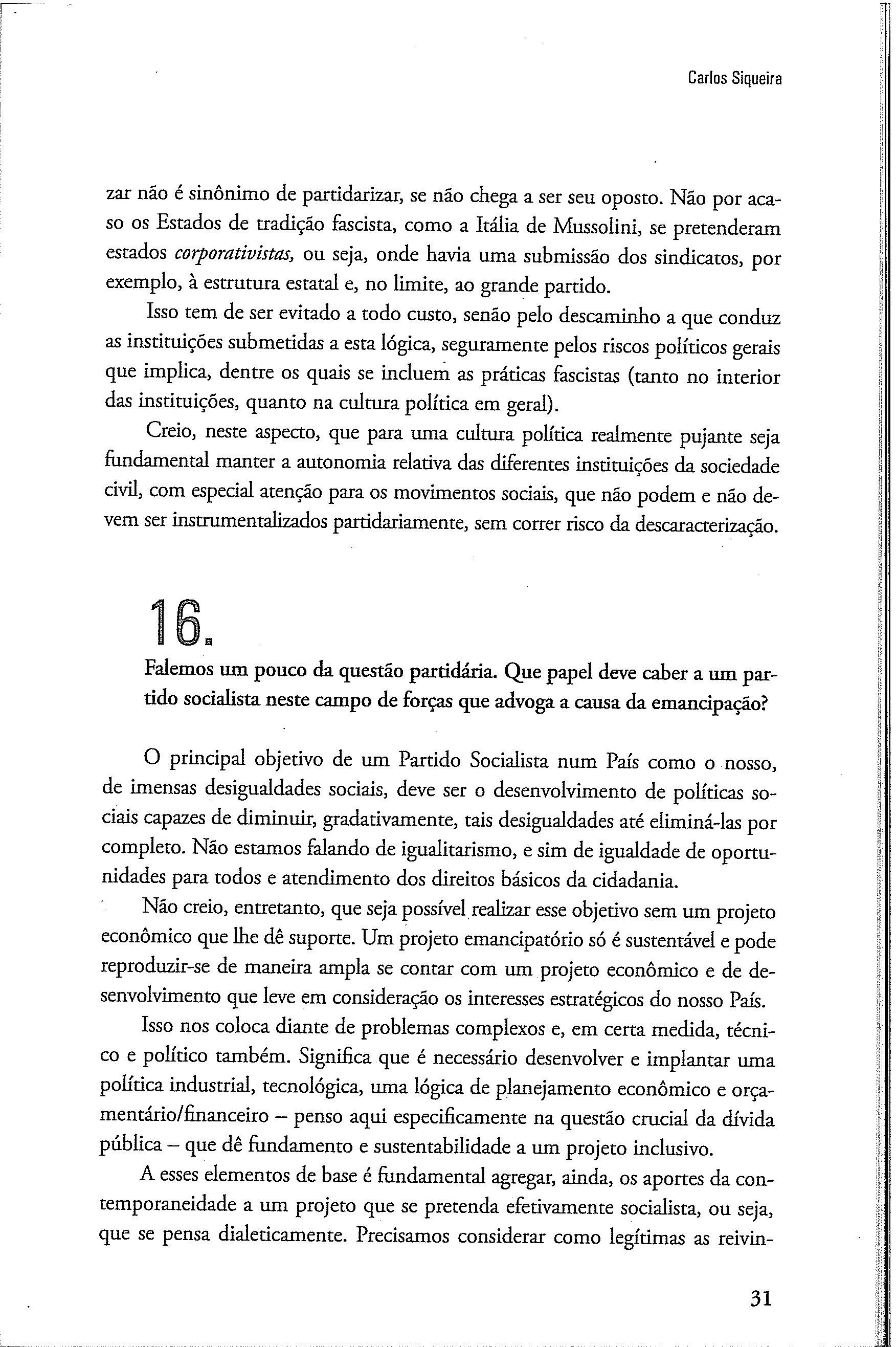 Publicação de 2009 que consiste em uma entrevista com Carlos Siqueira acerca de temas ligados ao socialismo, como: a diferença entre a concepção socialista e a liberal sobre a Liberdade; a necessidade de uma reforma política; características do neoliberalismo; qual o papel do PSB atualmente, entre outros.