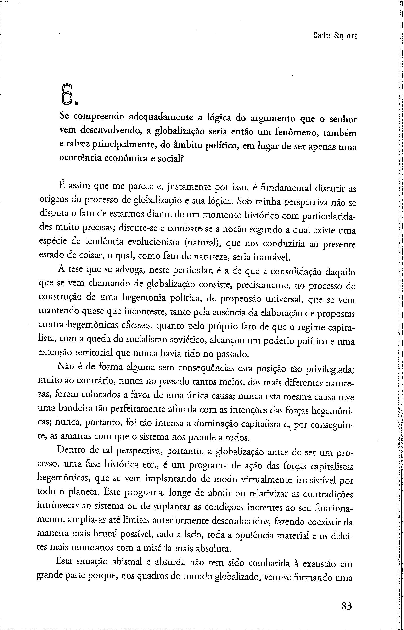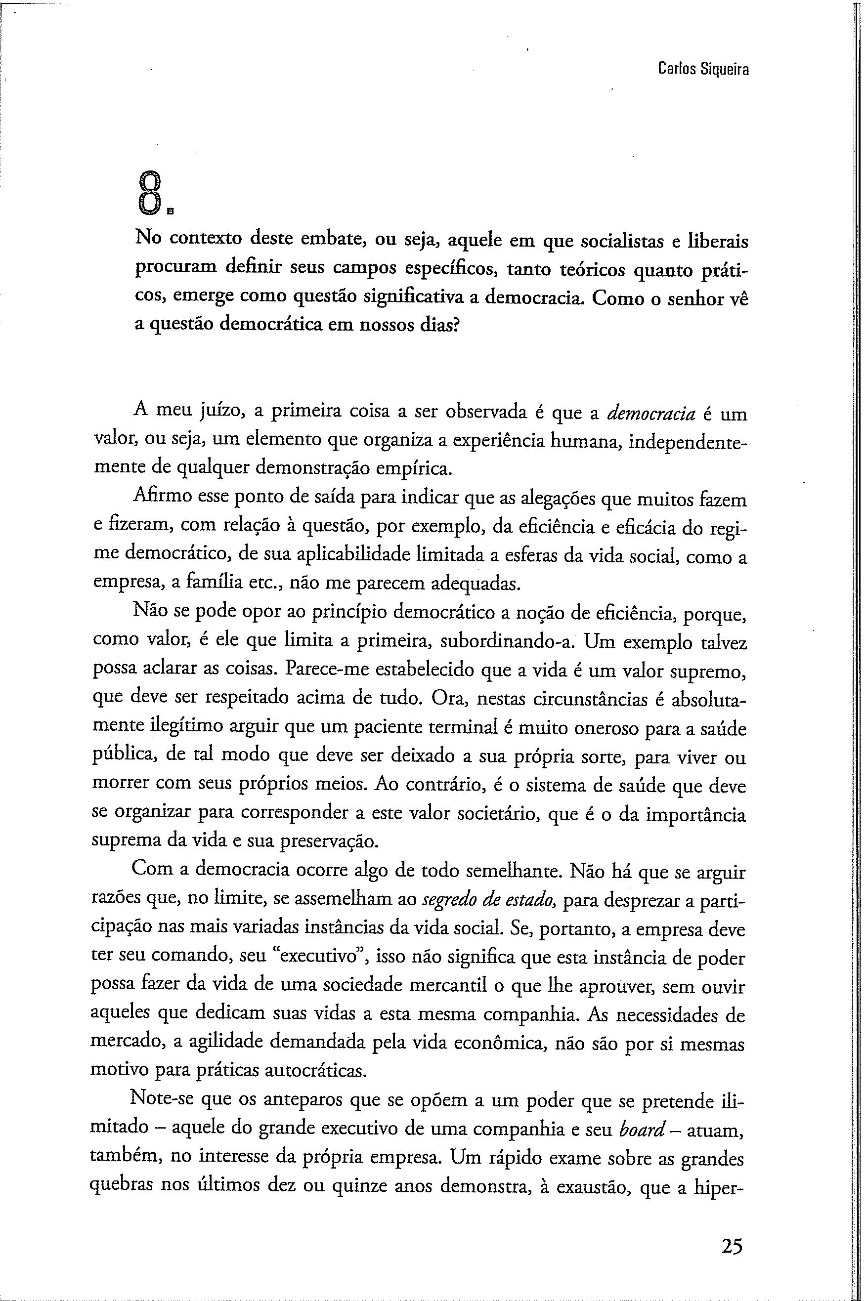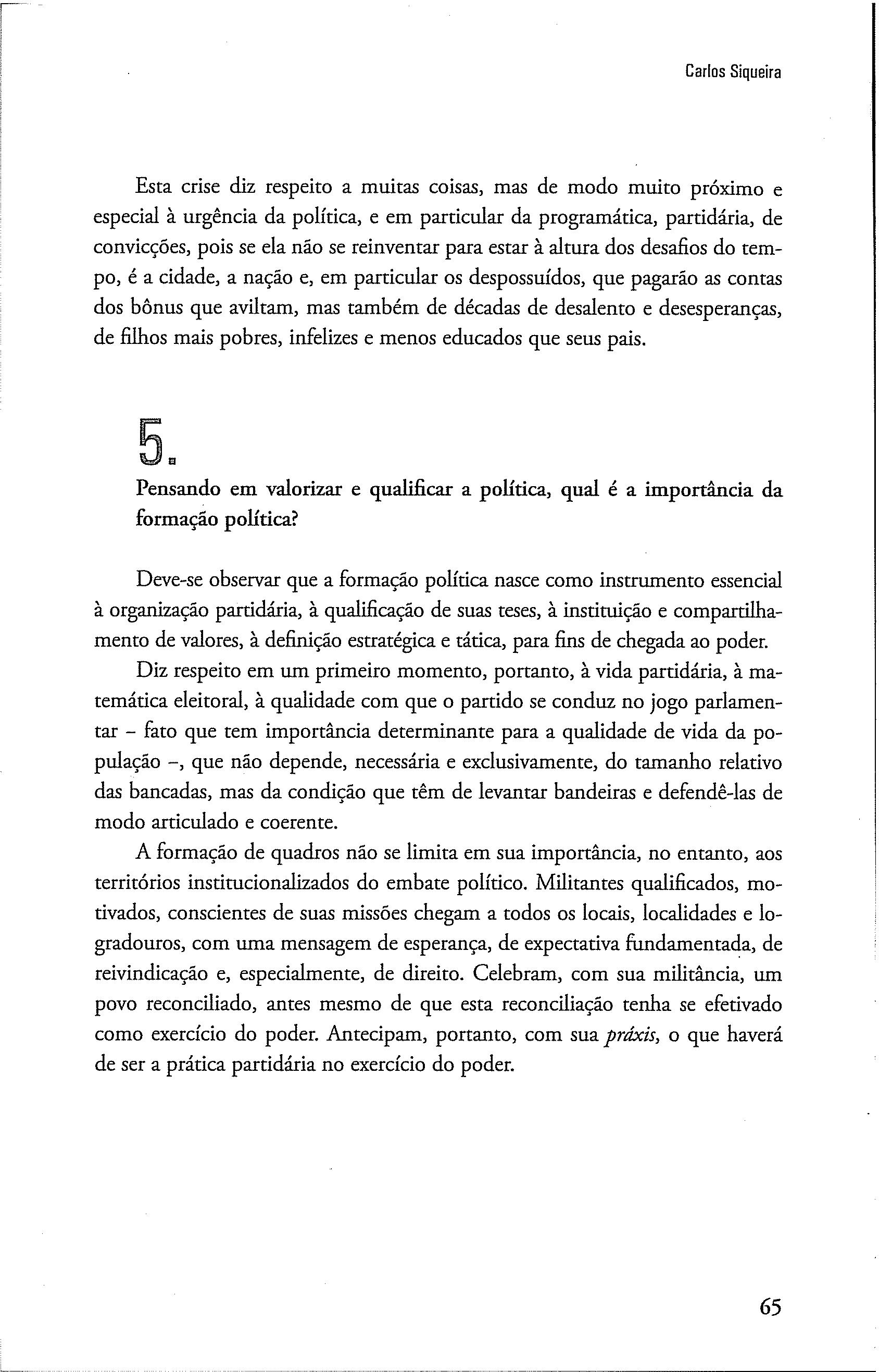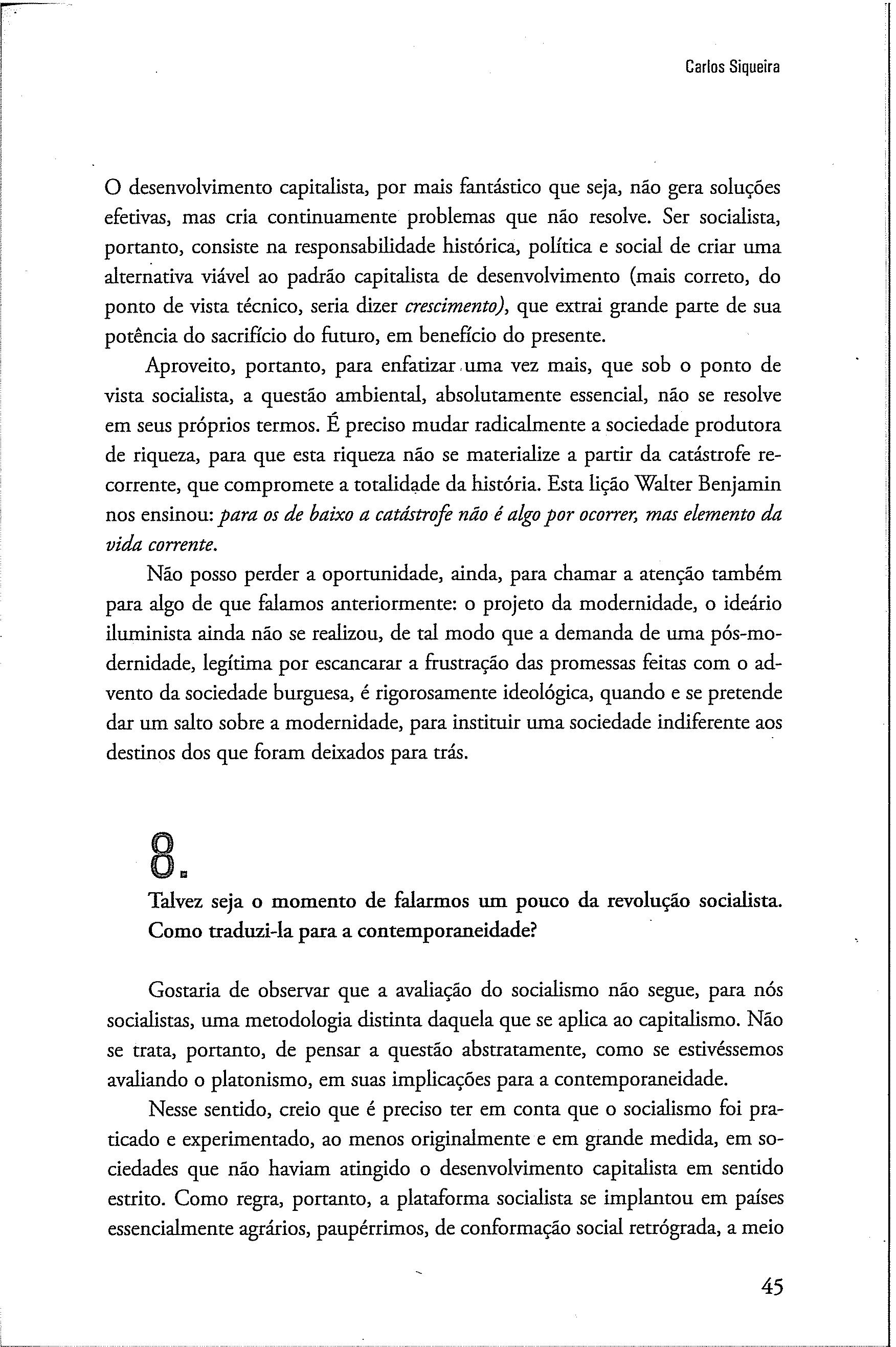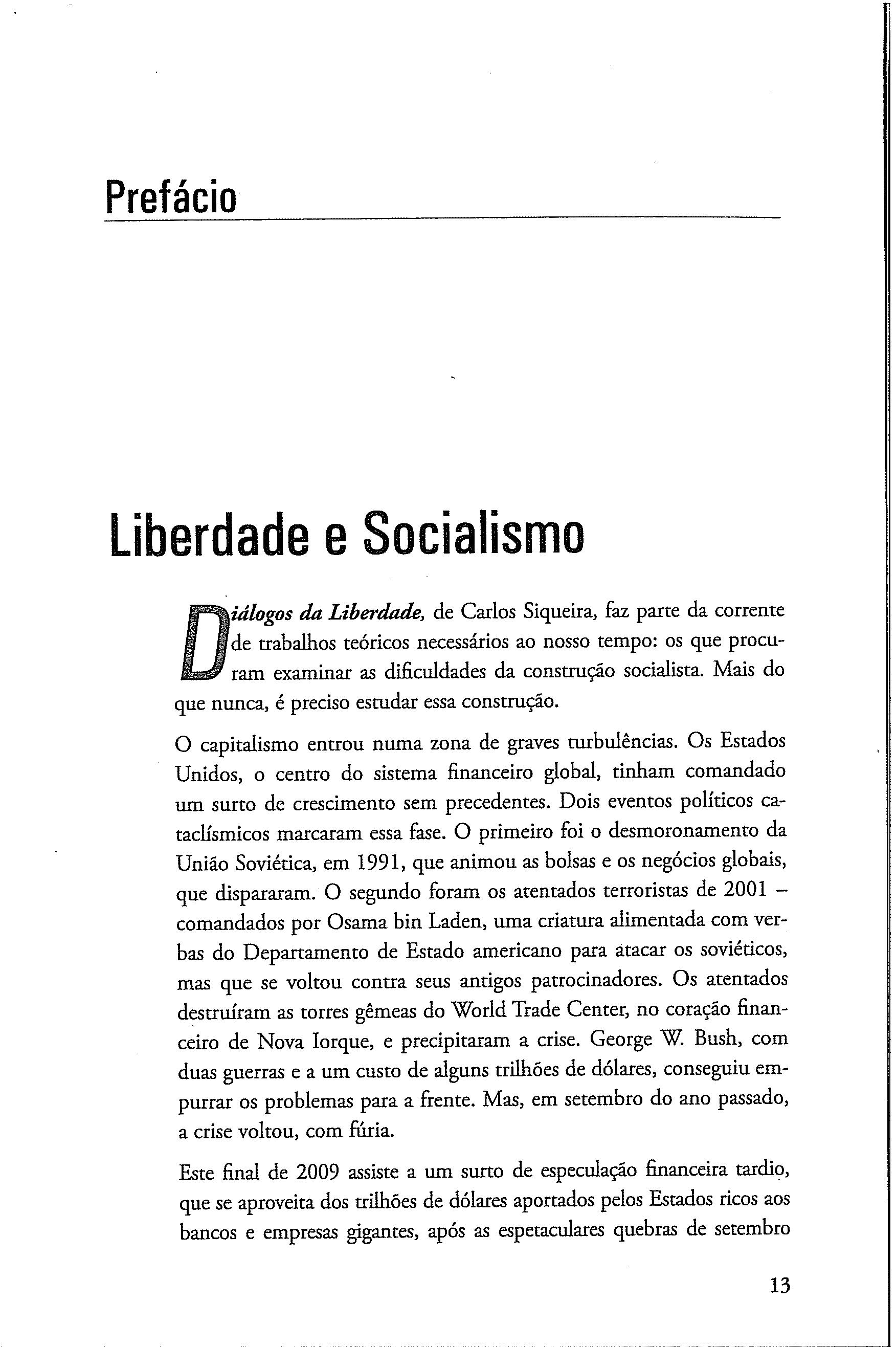 Publicação de 2009 que consiste em uma entrevista com Carlos Siqueira acerca de temas ligados ao socialismo, como: a diferença entre a concepção socialista e a liberal sobre a Liberdade; a necessidade de uma reforma política; características do neoliberalismo; qual o papel do PSB atualmente, entre outros.