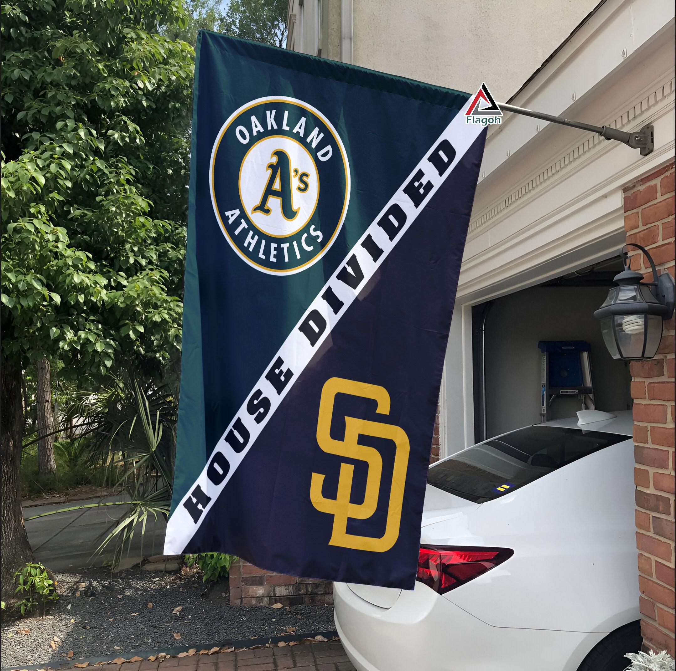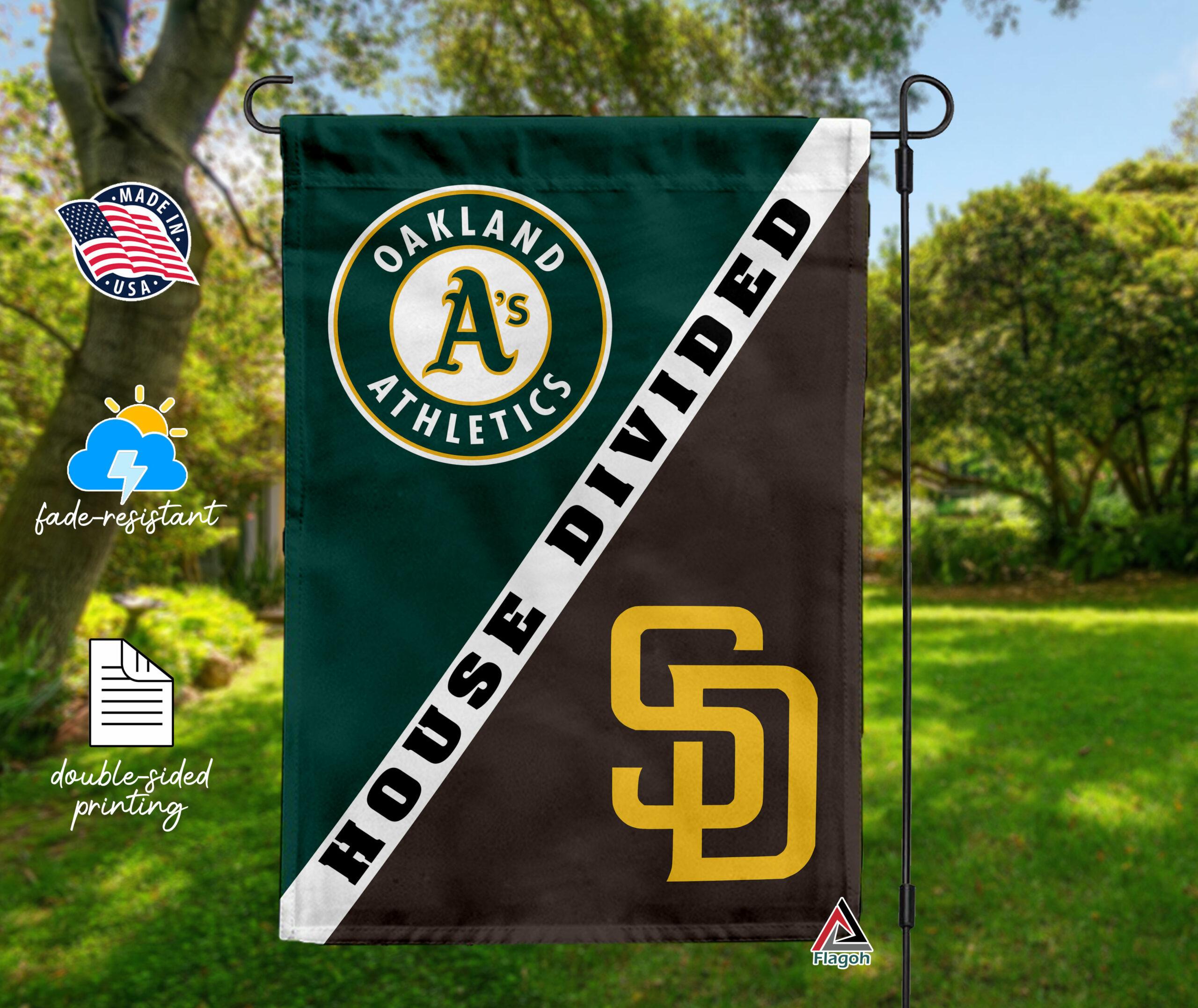 Is your household embroiled in a classic baseball battle between the "Swinging A's" and the sunny shores of San Diego? Do debates about Rickey Henderson's stolen base legacy and the dazzling defense of Fernando Tatis Jr. erupt over dinner? Celebrate your love for both these intriguing MLB teams with our Athletics vs. Padres House Divided Flag! This unique flag showcases your unwavering baseball passion in style, featuring a bold design with the iconic colors and logos of the Oakland Athletics and the San Diego Padres.