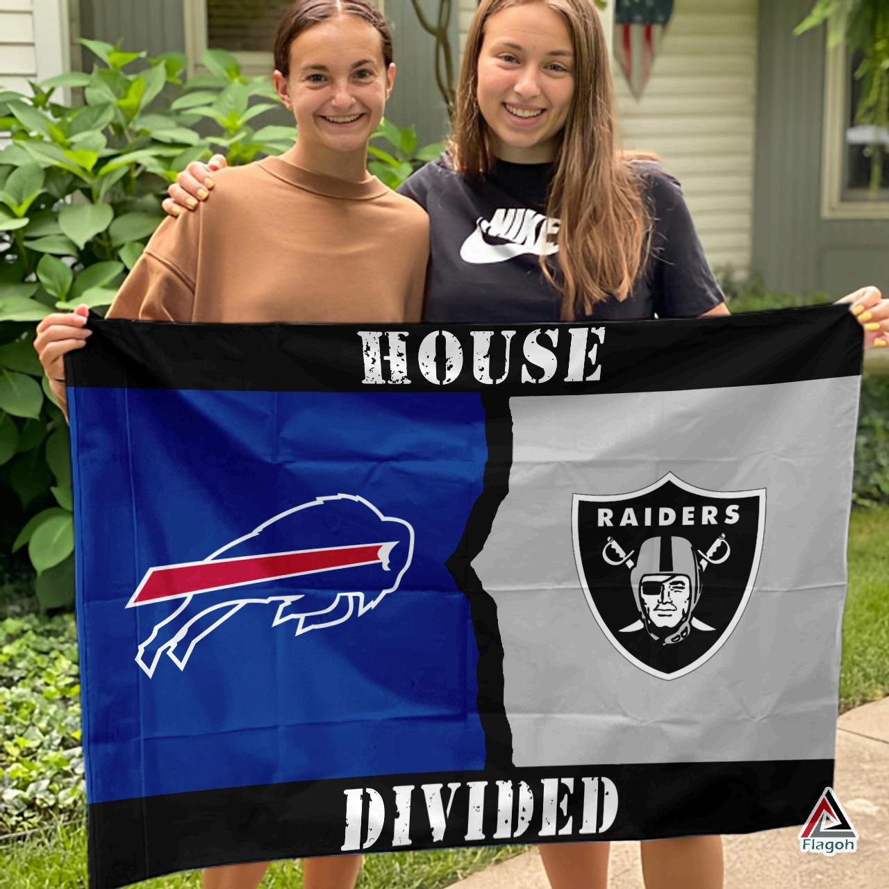 The Bills vs Raiders House Divided Flag is not just any decoration Crafted from premium materials, this flag withstands the elements while proudly displaying the fierce competition between these two iconic NFL teams. Whether you're tailgating, hosting game day gatherings, or simply decorating your home, this flag makes a bold statement of loyalty and sportsmanship