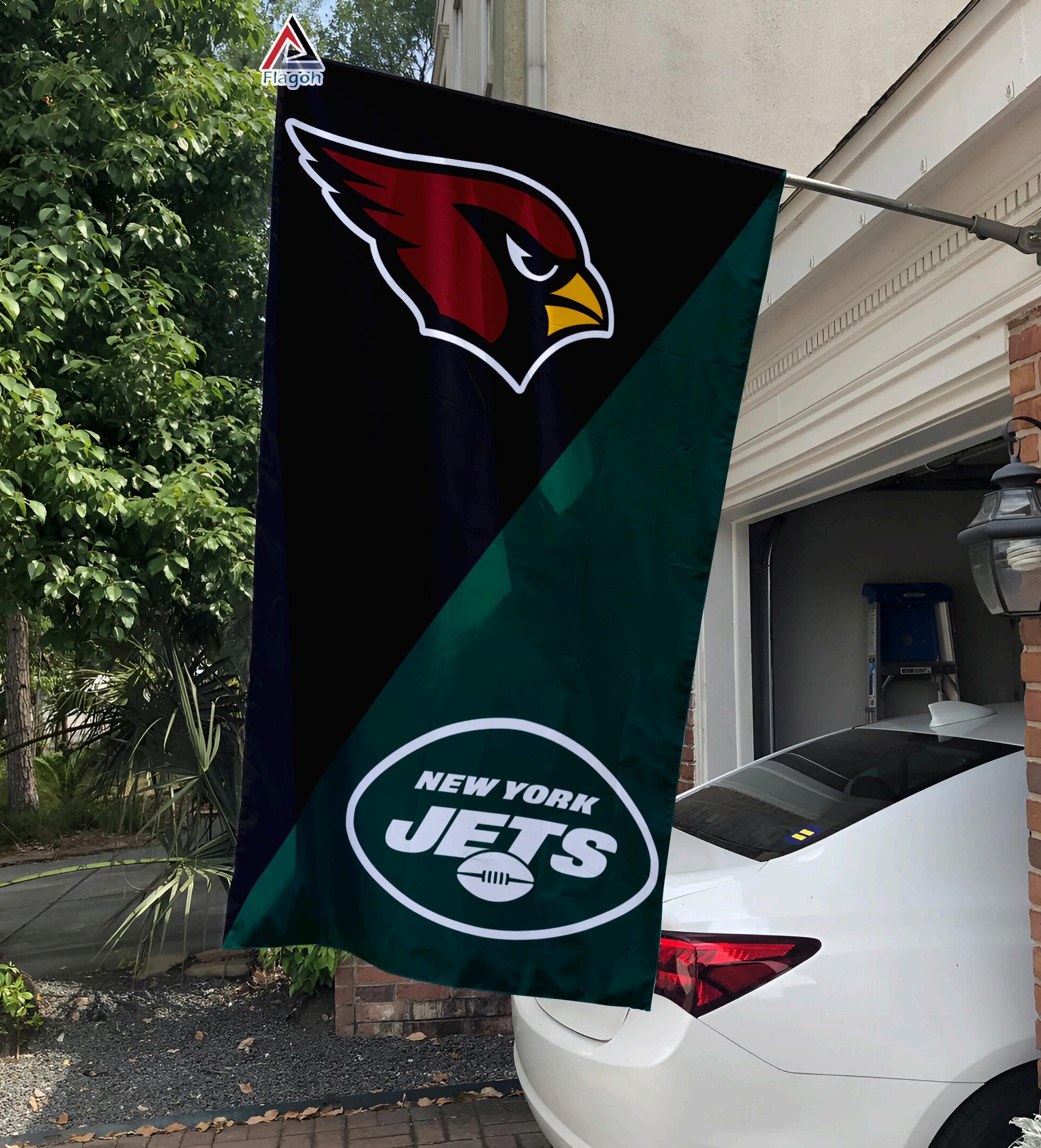 Displaying this flag conveys your enthusiastic support and connects you instantly with other dedicated football fans. It's not just a decorative piece – it's a symbol of your passion, rivalry, and love for the sport. Featuring both the Arizona Cardinals and New York Jets logos, it honors the spirit of competition between these iconic NFL teams.