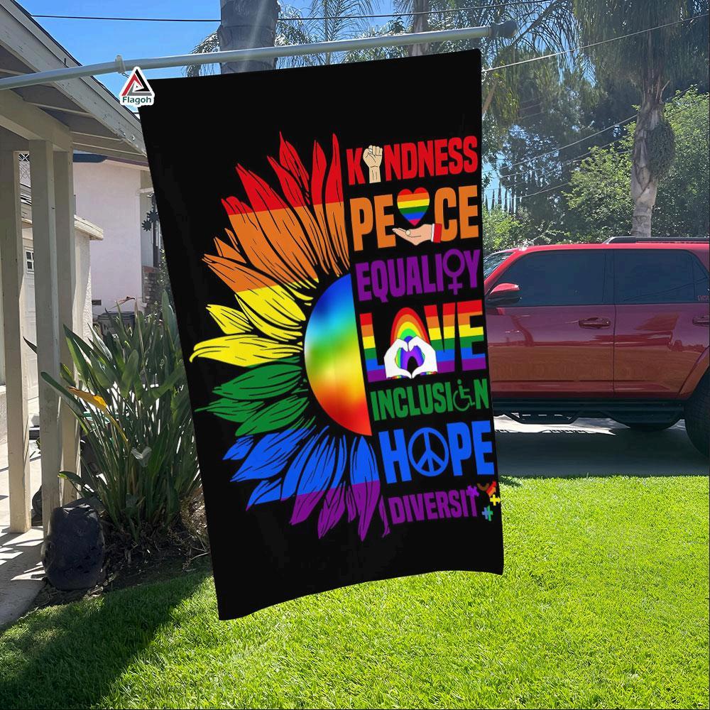 Brighten your garden and uplift your community spirit with the vibrant Sunflower Pride Flag, Kindness Peace Equality Garden Flag, Hippie Lawn Decor. This beautifully crafted flag combines the warm symbolism of sunflowers with powerful messages of kindness, peace, and equality, making it the perfect decor for anyone who wishes to spread love and inclusiveness right from their own lawn.