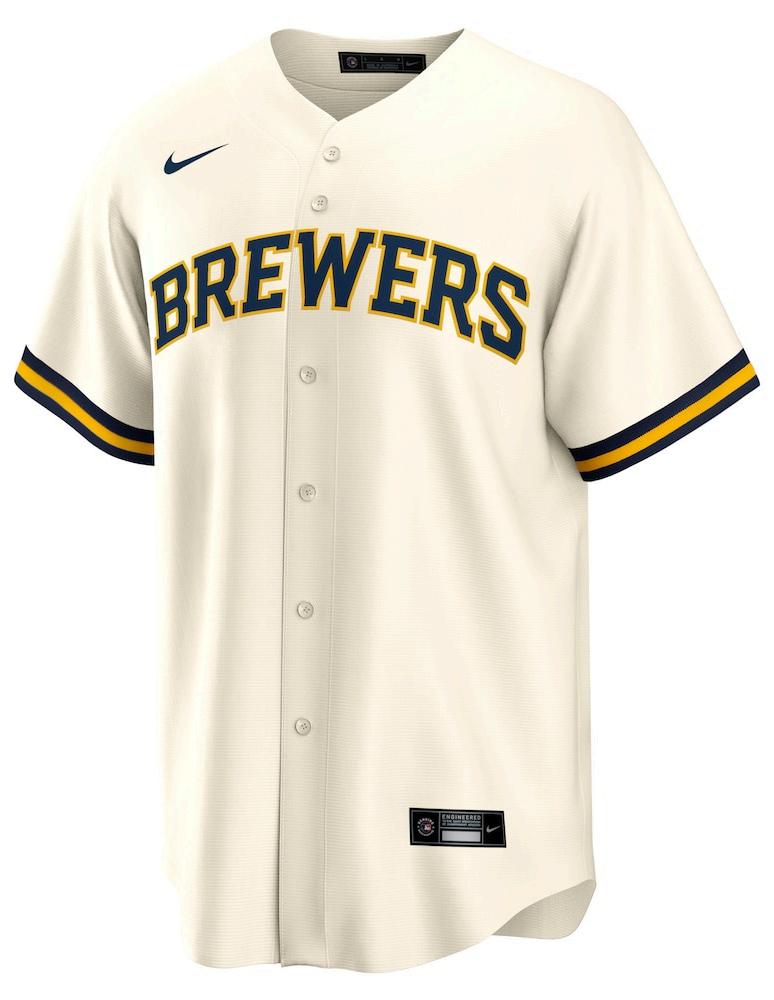 Designed with both comfort and durability in mind, this cream-colored replica is a standout piece in any fan's collection. It perfectly mirrors the look of the o cial player jerseys worn by Christian Yelich himself, making it a must-have for collectors and fans alike.
