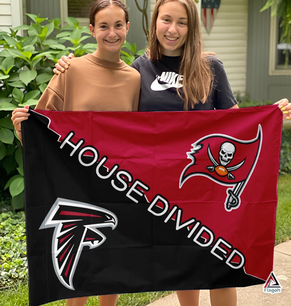 Falcons vs Buccaneers House Divided Flag meaning: This unique divided flag captures families navigating NFL passions between Georgia cities. Featuring the iconic Falcons' logo facing the iconic Buccaneers' logo, it celebrates loyalties now tested between Matt Ryan's veteran leadership of Atlanta and Tom Brady's championship excellence guiding Tampa Bay. Whether cheering Matty Ice or Brady, this banner honors allegiances between Sun Belt rivals.