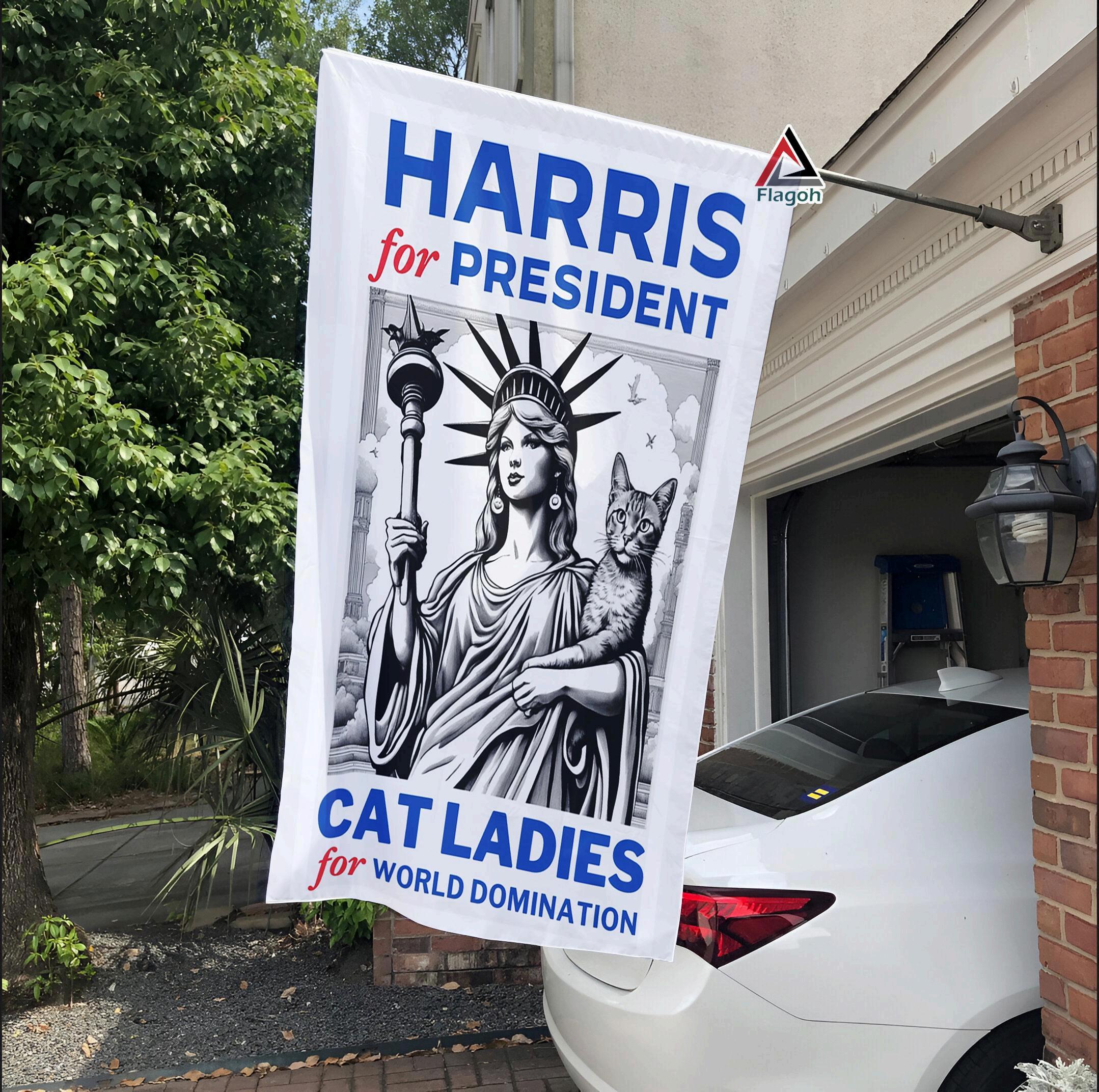 More than just a decorative flag, the Harris For President Cat Ladies For World Dominations Flag represents a fusion of historic American freedom ideals and contemporary cultural expression Crafted to grab attention and spark conversations, this flag is a fantastic addition to your home, garden, or campaign collection.