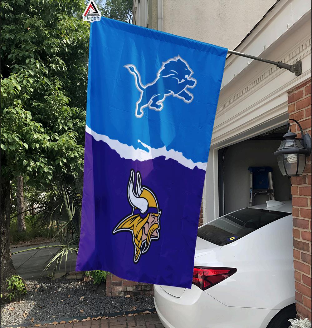 Don't miss out on this unique way to celebrate your favorite teams' rivalry Enhance your football experience with the Lions vs Vikings House Divided Flag, NFL House Divided Flag and show your true colors!