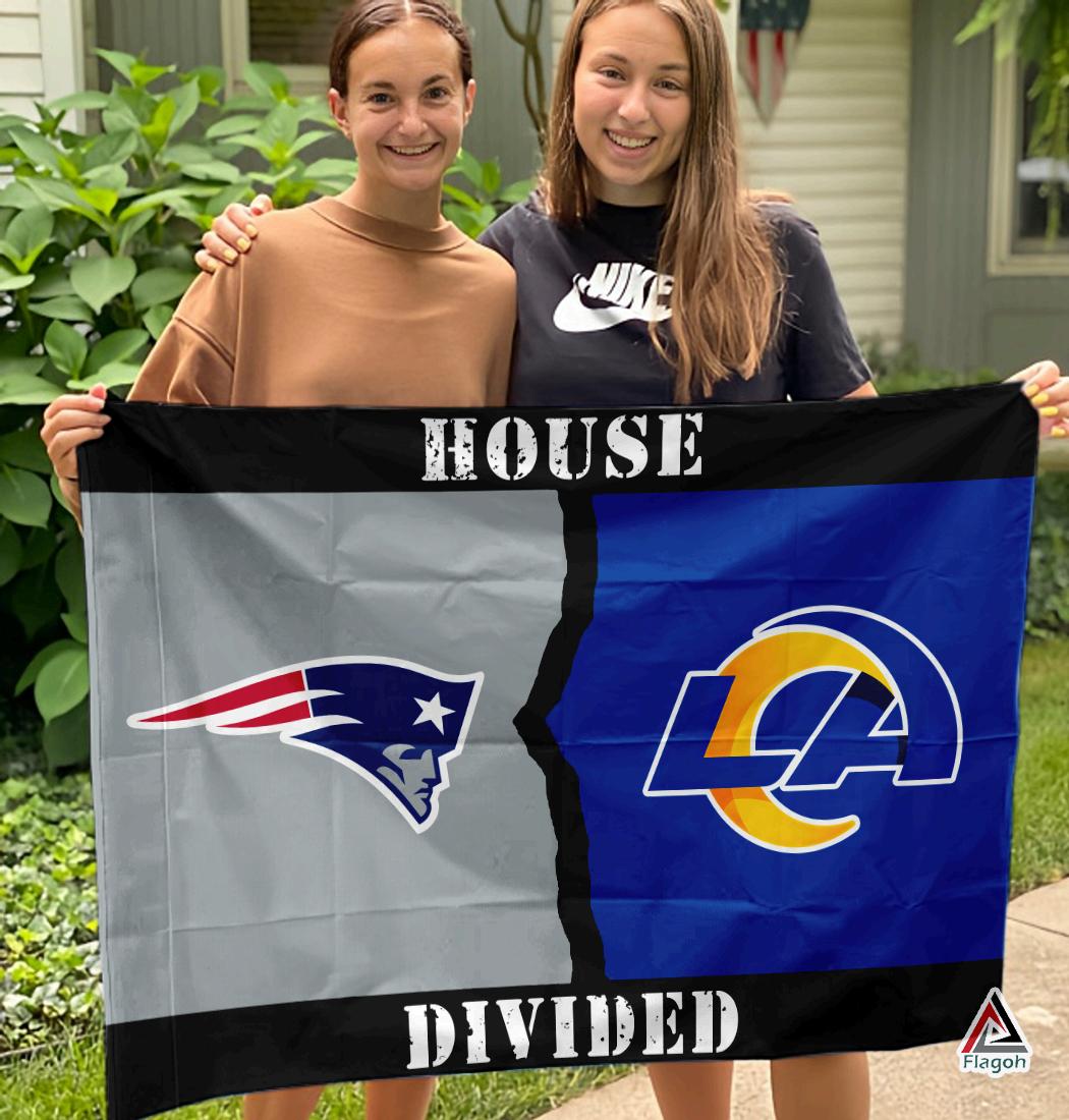 The Patriots vs Rams House Divided Flag, NFL House Divided Flag is crafted with high-quality materials to endure all weather conditions, ensuring your team spirit shines come rain or shine. Its bold design features striking team colors and logos, making it impossible for guests to miss your enthusiasm for these two iconic franchises.