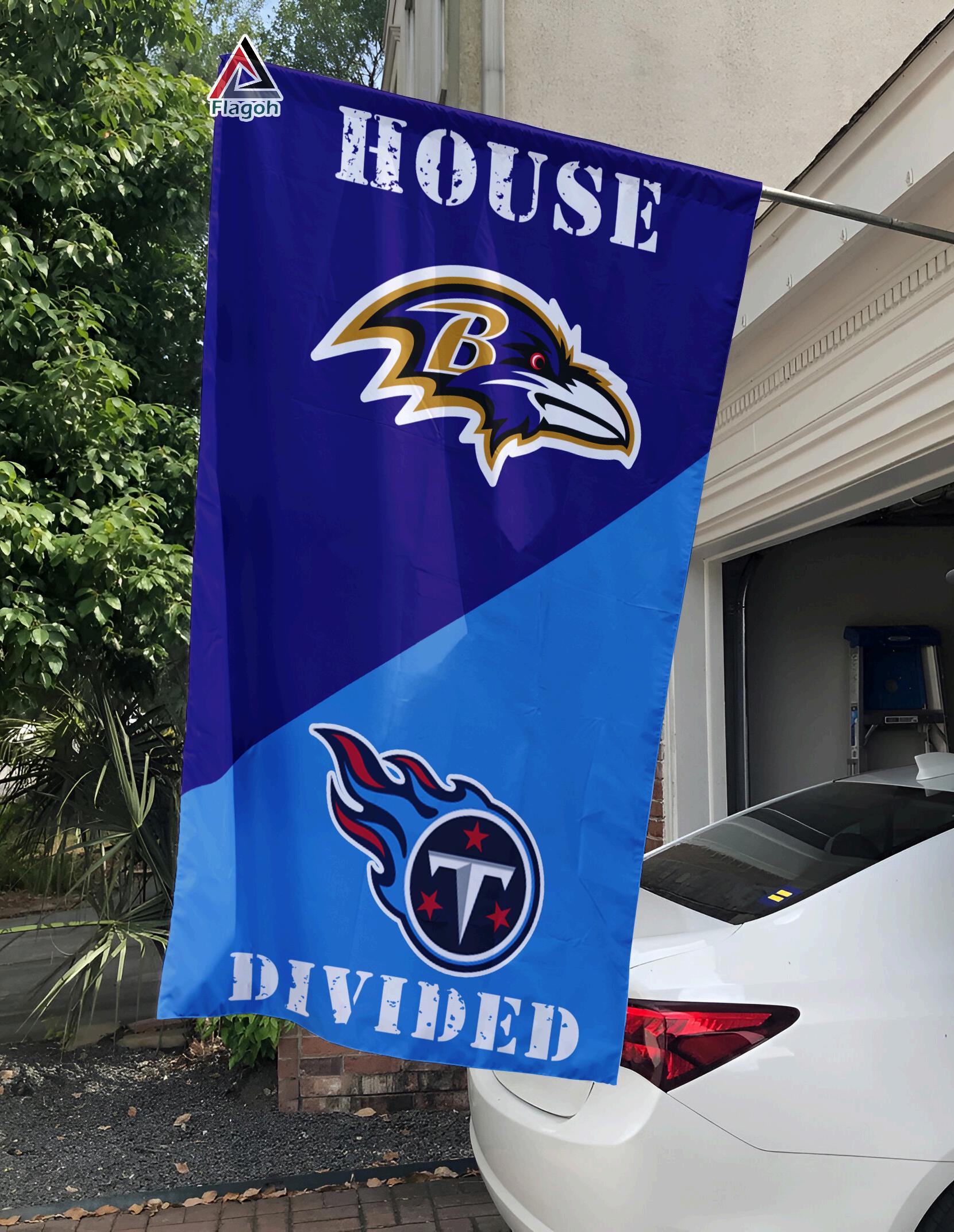 Get ready to elevate your game day spirit with the Ravens vs Titans House Divided Flag, NFL House Divided Flag Cra ed specially for passionate fans, this ag combines the iconic symbols of Baltimore Ravens and Tennessee Titans, giving your home or garden a powerful football vibe