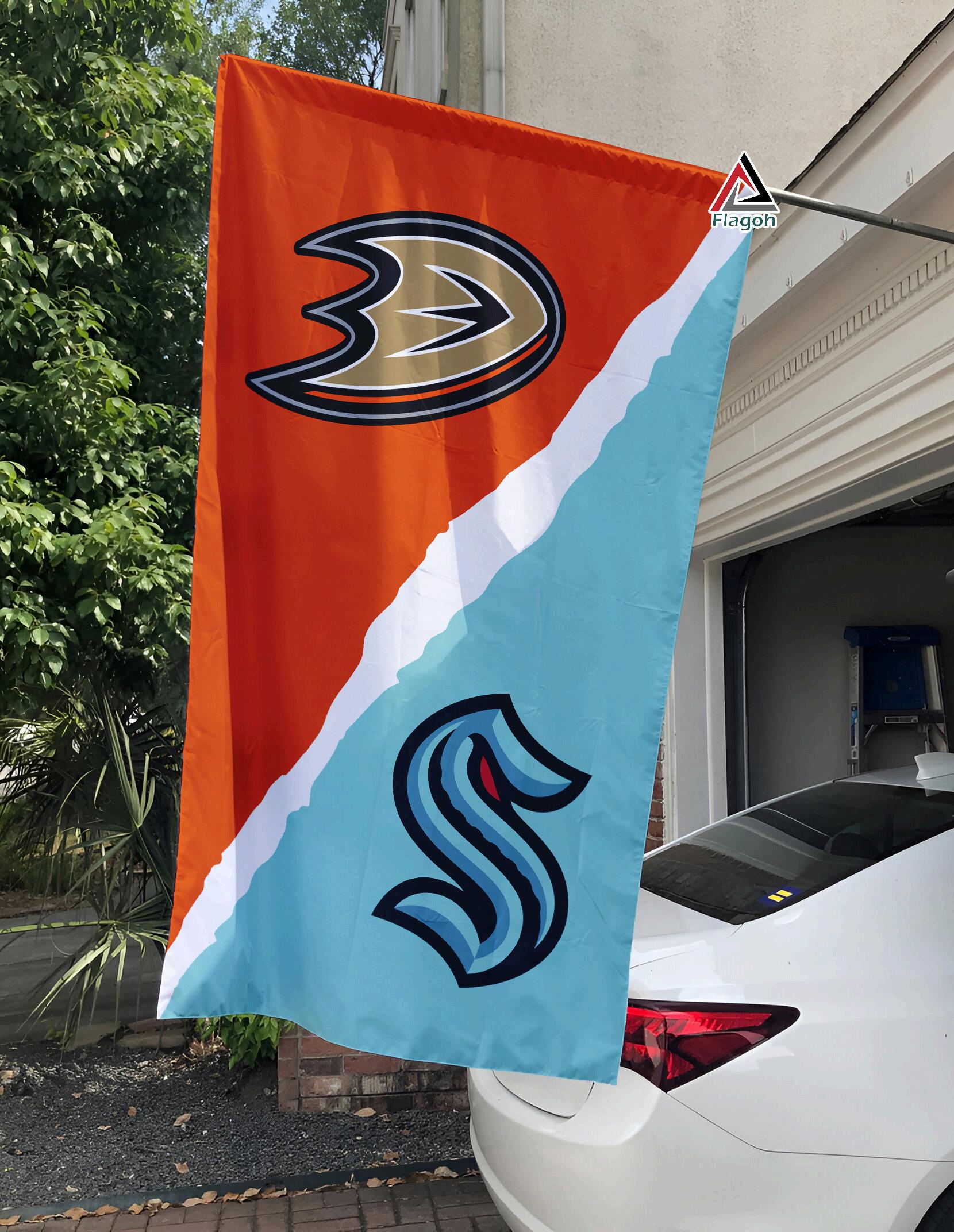 If you're a proud supporter of the NHL's Anaheim Ducks and Seattle Kraken, the Ducks vs Kraken House Divided Flag, NHL House Divided Flag is the perfect way to showcase your team loyalty is eyecatching ag splits the spirited colors and logos of both teams, making it an ideal addition to any home or man cave.
