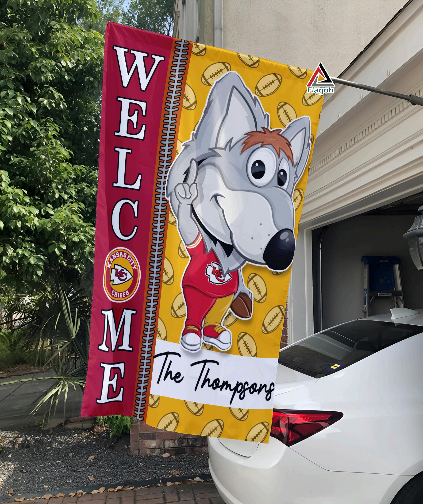 Kansas City Chiefs Football Flag, KC Wolf Mascot Personalized Football Fan Welcome Flags, Custom Family Name NFL Premium Decor