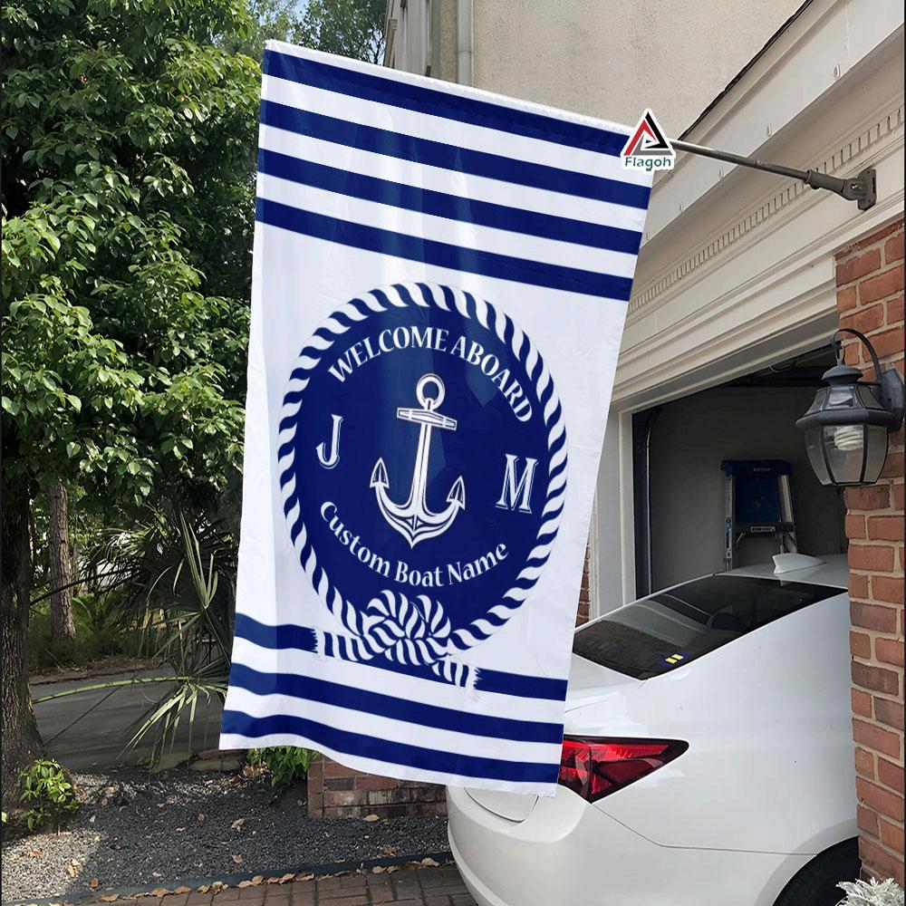 Set sail with style and a personal touch by showcasing your boat's identity with the Welcome Nautical Flag. This exquisitely designed flag features a custom boat name alongside a classic family monogram, creating a distinguished look that enhances your vessel’s charm. Crafted on a crisp white background, this personalised flag is perfect for those who want to blend nautical tradition with contemporary personalization.