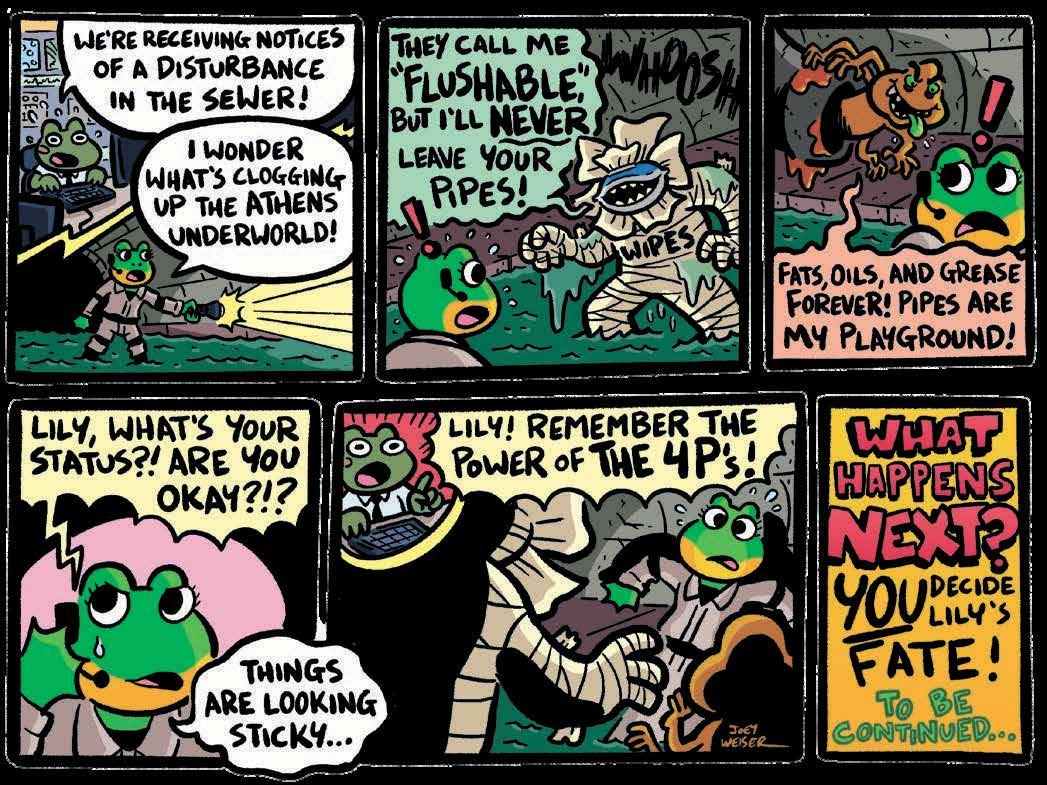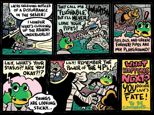 Will Lily triumph with a heroic flush? Will Athens’ sewers flow freely again? Send us your best final panel idea—or even draw your own comic strip. Email your ending by Dec 5, 2025 to savewater@accgov.com, and use the 4Ps to help Lily and Tad keep Athens clog-free!