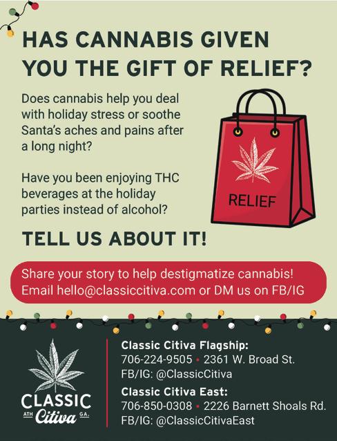 AFTER THE HOLIDAYS: Some folks burn their Christmas trees after the holidays. If you’re already planning a bonfire, crunchy branches make great kindling. Some people place old trees outside and give them a second life as a winter home for wildlife. If neither of those options appeal to you, Keep Athens Clarke County Beautiful will host its annual “Bring One for the Chipper” event. Residents can bring live, undecorated trees for the county to turn into mulch. For more about dates and locations, visit accgov.com/ chipper. f