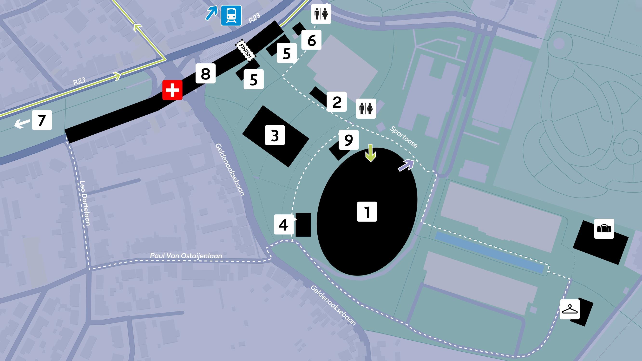 De start- en finishzones liggen op wandelafstand van het station: