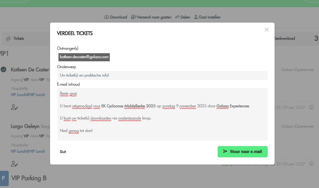 ➋ Verzend de geselecteerde tickets naar emailadressen van de toegewezen gasten.