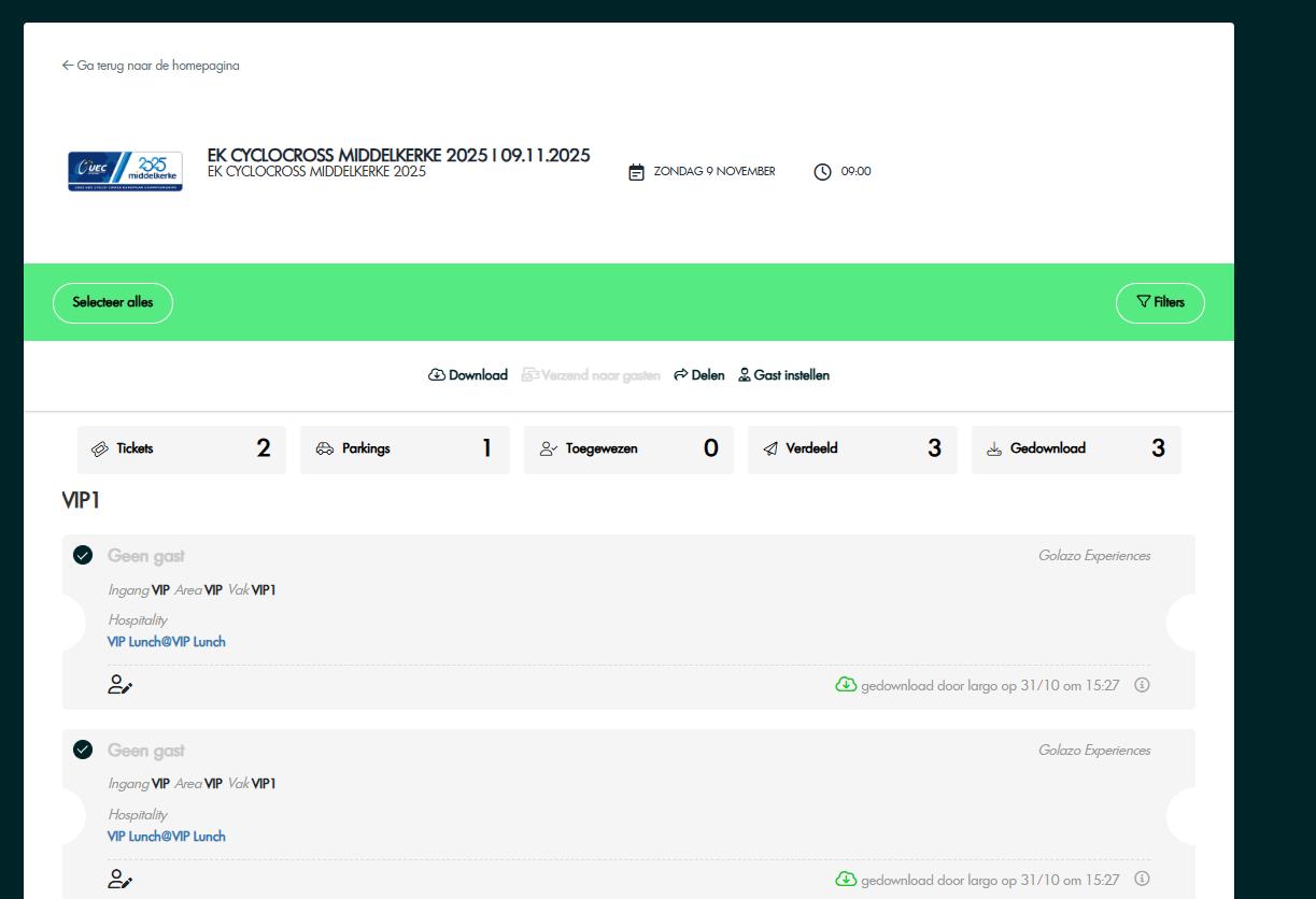 U kan dus 2 VIP-tickets én 1 parkingticket selecteren, deze toewijzen aan uw gast(en) en vervolgens samen verzenden.