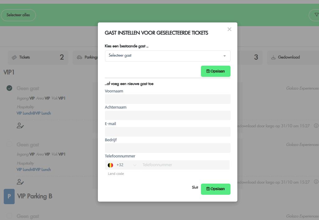 • Gast instellen: Eens geselecteerd, kan u per ticket een gast instellen U kan ook meerdere tickets aanklikken en toewijzen aan één gast door bovenaan te klikken op ‘gast instellen’.