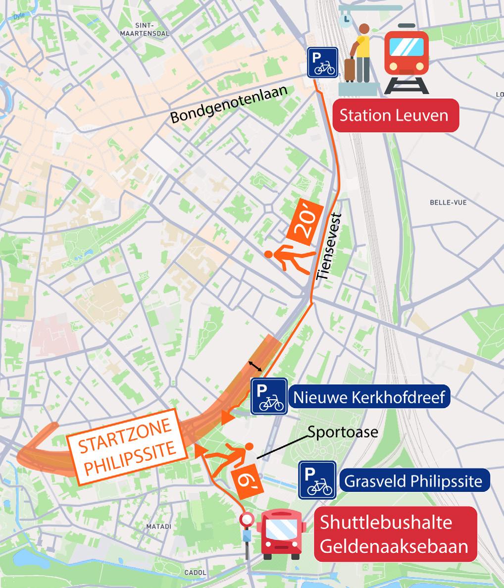 If you want to get home quickly and easily, just walk to Leuven station from the finish, this is the quickest and most comfortable option for continuing your journey. If you parked your car in Parking Brabanthal or you are going to be picked up there by supporters, the shuttle service runs between 7 a.m. and 7.30 p.m. and will ensure a smooth connection between the finish area and Parking Brabanthal. The pick-up location at the finish area is on Geldenaaksebaan.