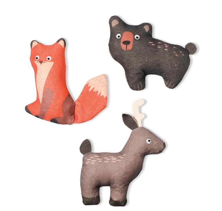 Set of 3 cat toys printed with water based, non-toxic inks or felt material with embroidered details. Each toy includes North American grown catnip and crinkle paper inside. Toys come attached to backer card.