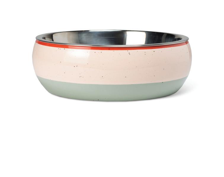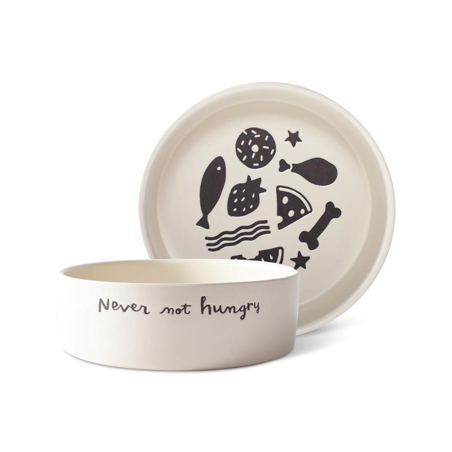 Ceramic dog bowls with glossy color glaze, contrast interior color, and art by Madison Safer. Small bowls hold approximately 1.25 cups. Medium bowls hold approximately 3.25 cups.